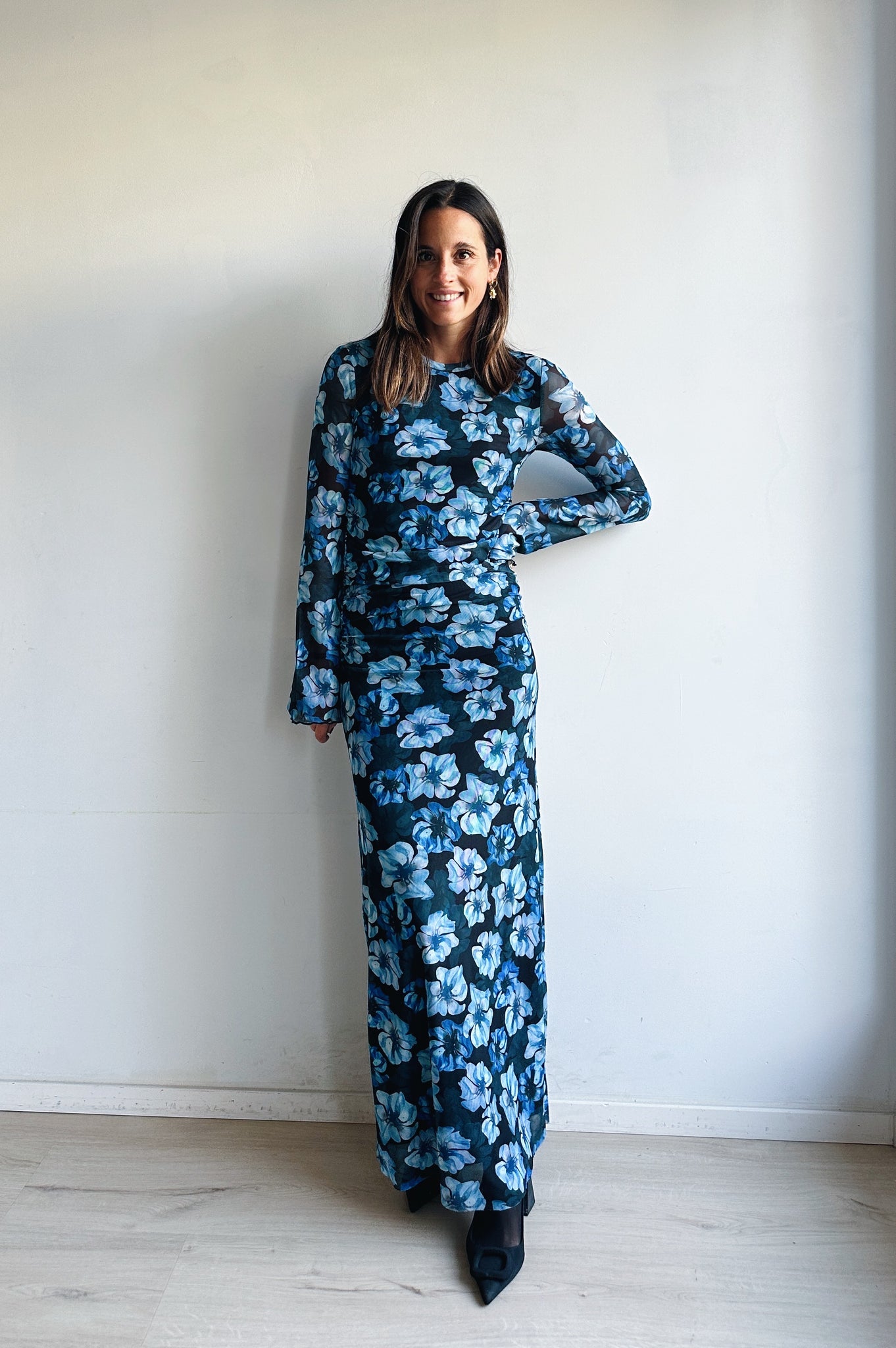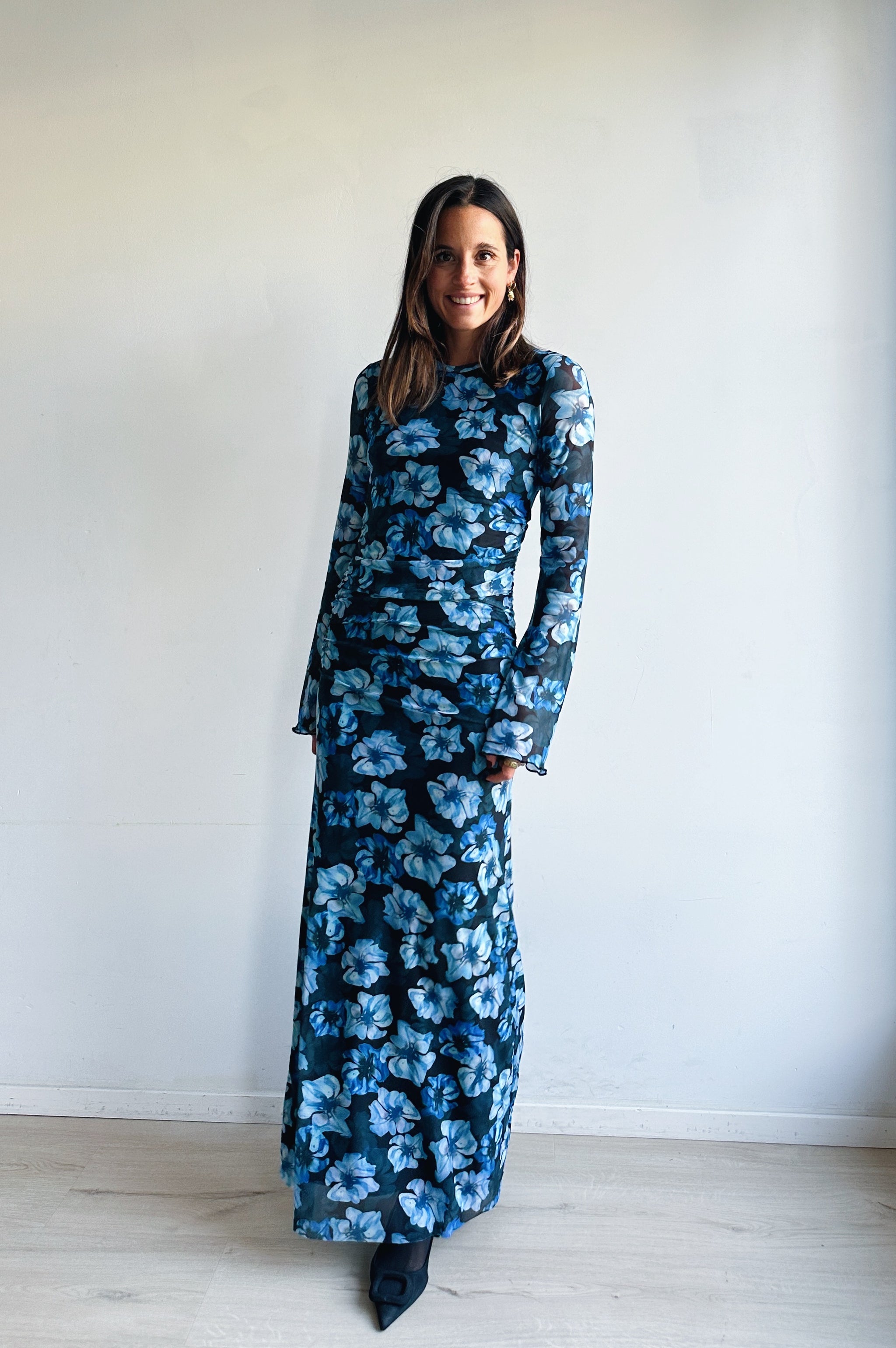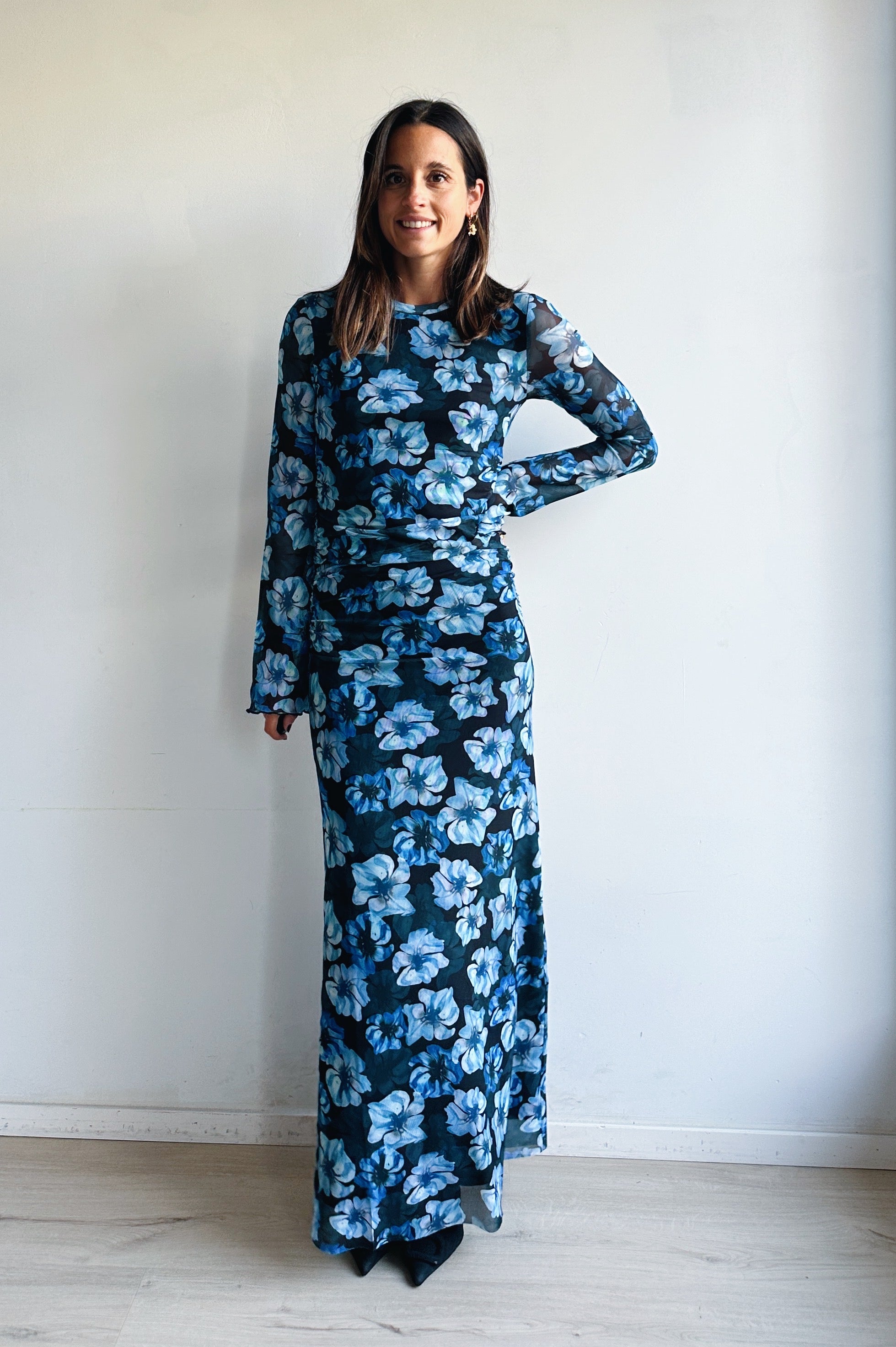 Deze elegante maxi-jurk straalt vrouwelijkheid en verfijning uit. De zachte meshstof volgt subtiel je silhouet en zorgt voor een flatterende pasvorm. De lange mouwen en nauwsluitende snit geven een stijlvolle, tijdloze look, terwijl de opvallende blauwe bloemenprint een speelse en frisse toets toevoegt.