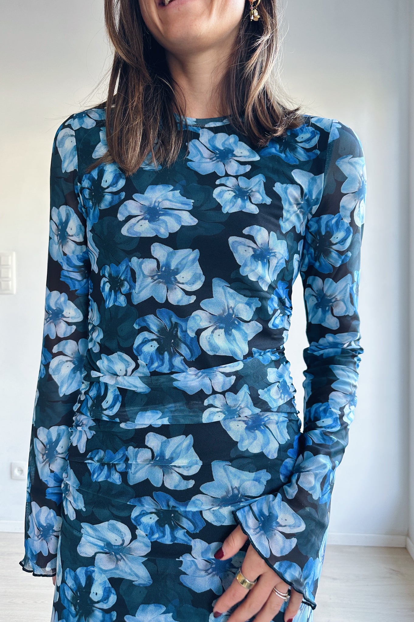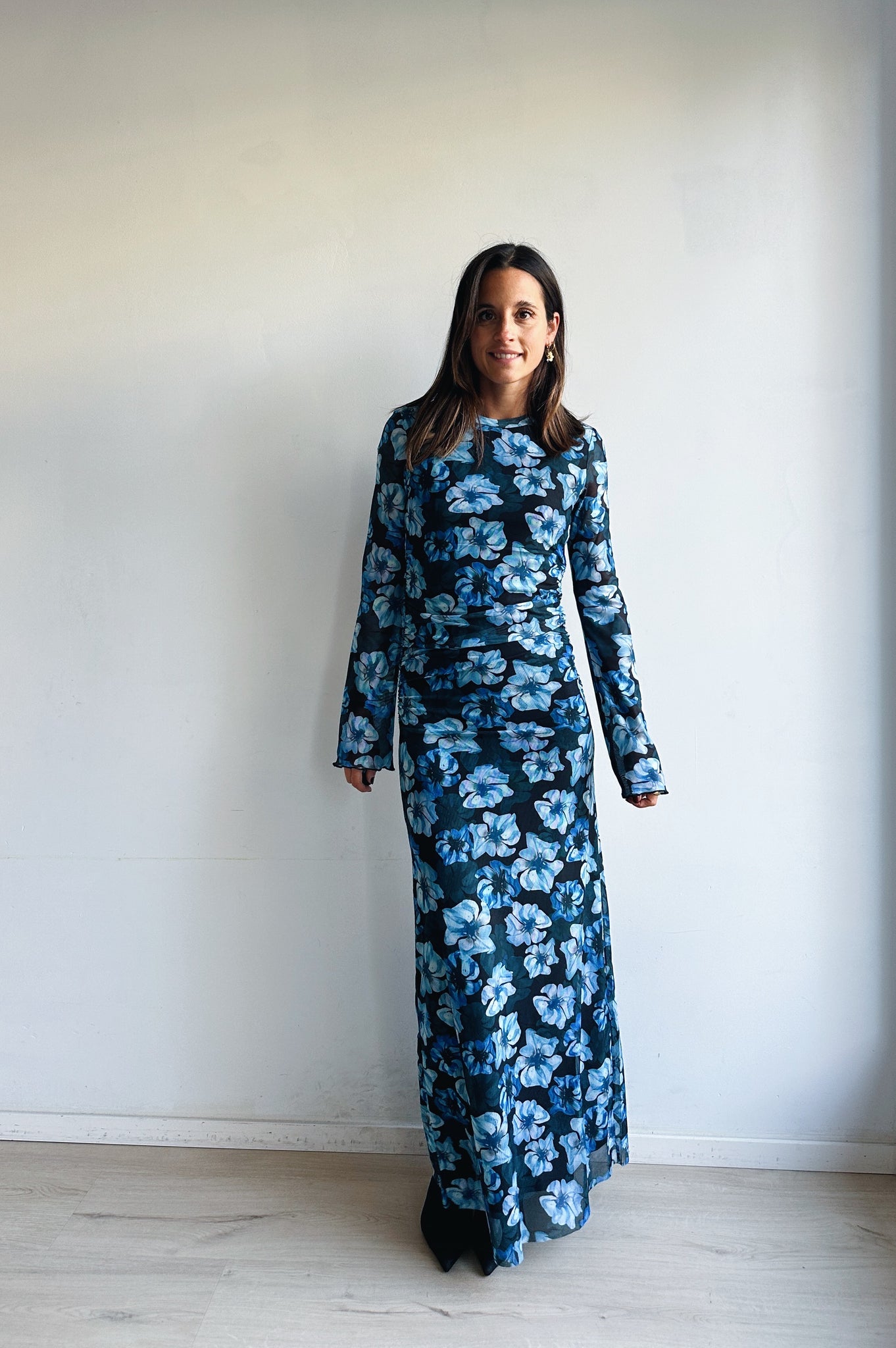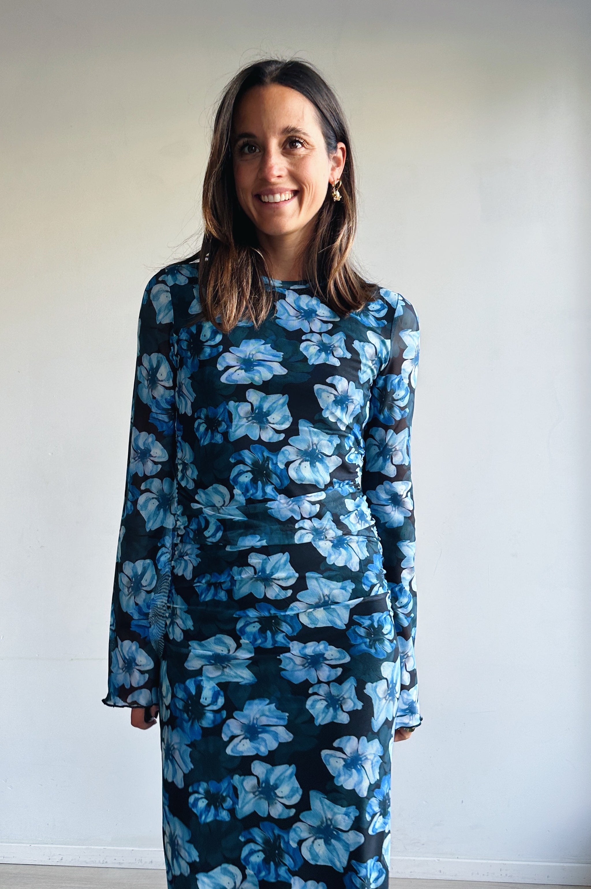 Deze elegante maxi-jurk straalt vrouwelijkheid en verfijning uit. De zachte meshstof volgt subtiel je silhouet en zorgt voor een flatterende pasvorm. De lange mouwen en nauwsluitende snit geven een stijlvolle, tijdloze look, terwijl de opvallende blauwe bloemenprint een speelse en frisse toets toevoegt.