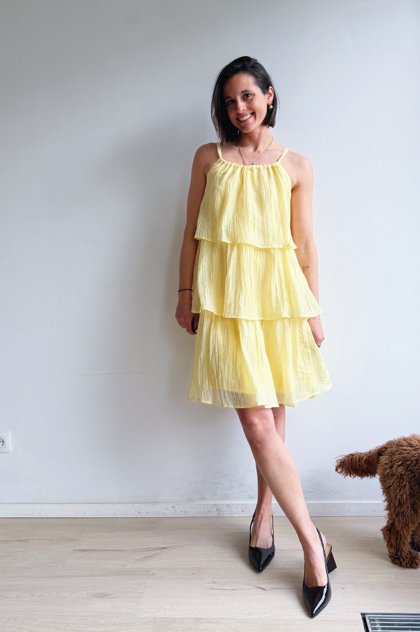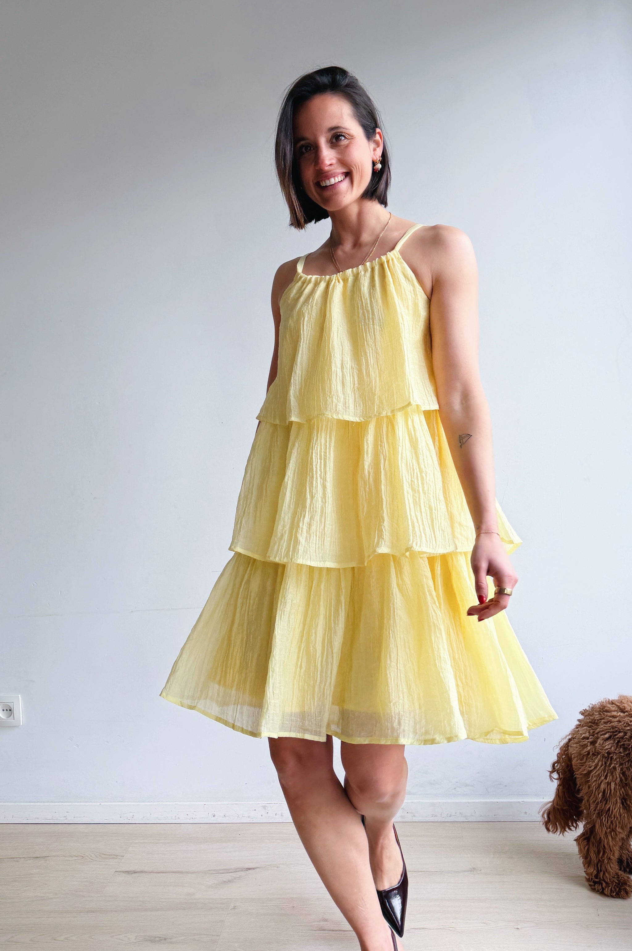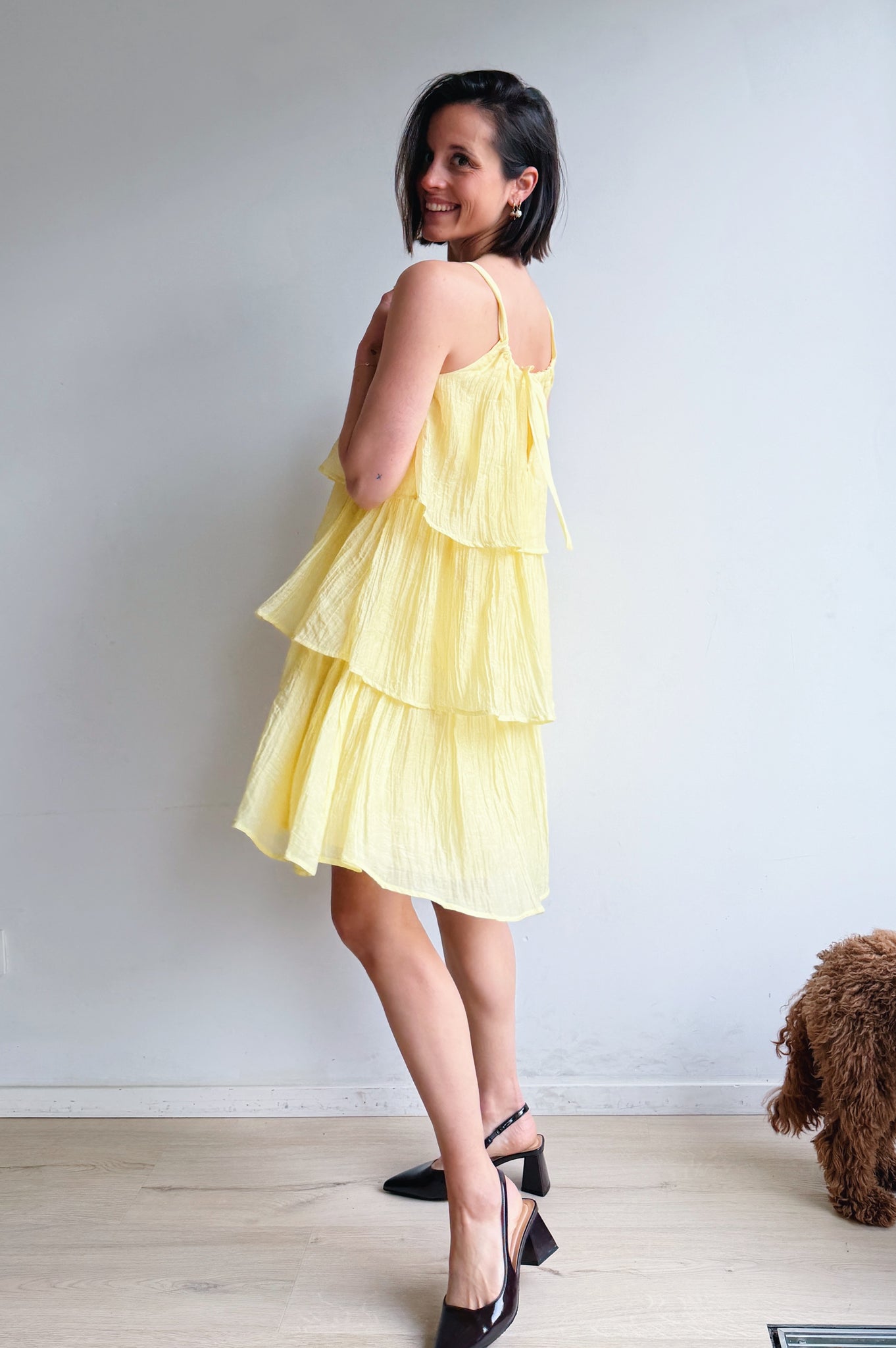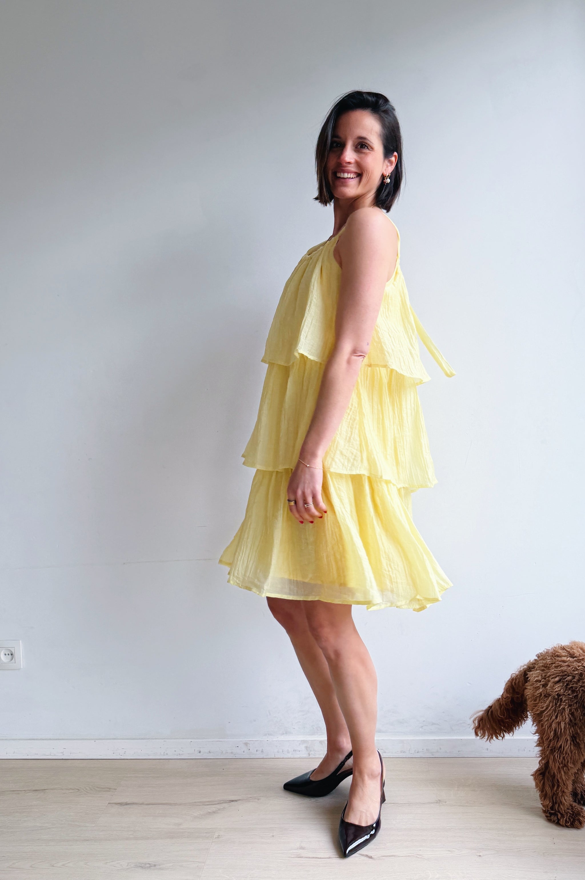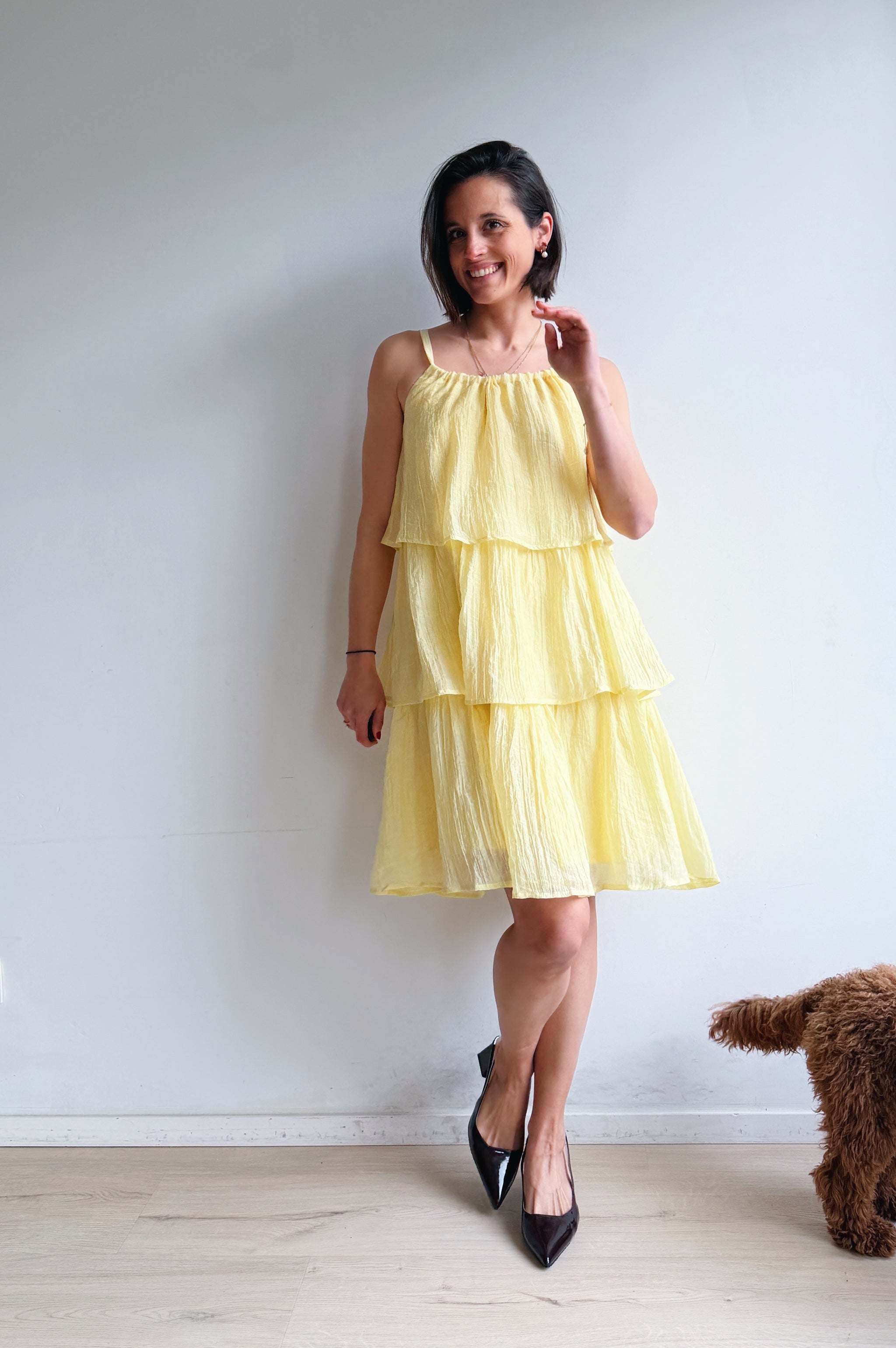 Luchtig, vrouwelijk en moeiteloos stijlvol. Deze jurk is ontworpen met speelse, gelaagde stroken die zorgen voor een vloeiende, elegante beweging bij elke stap. De lichte, ademende stof voelt comfortabel aan en maakt dit de perfecte jurk voor warmere dagen.