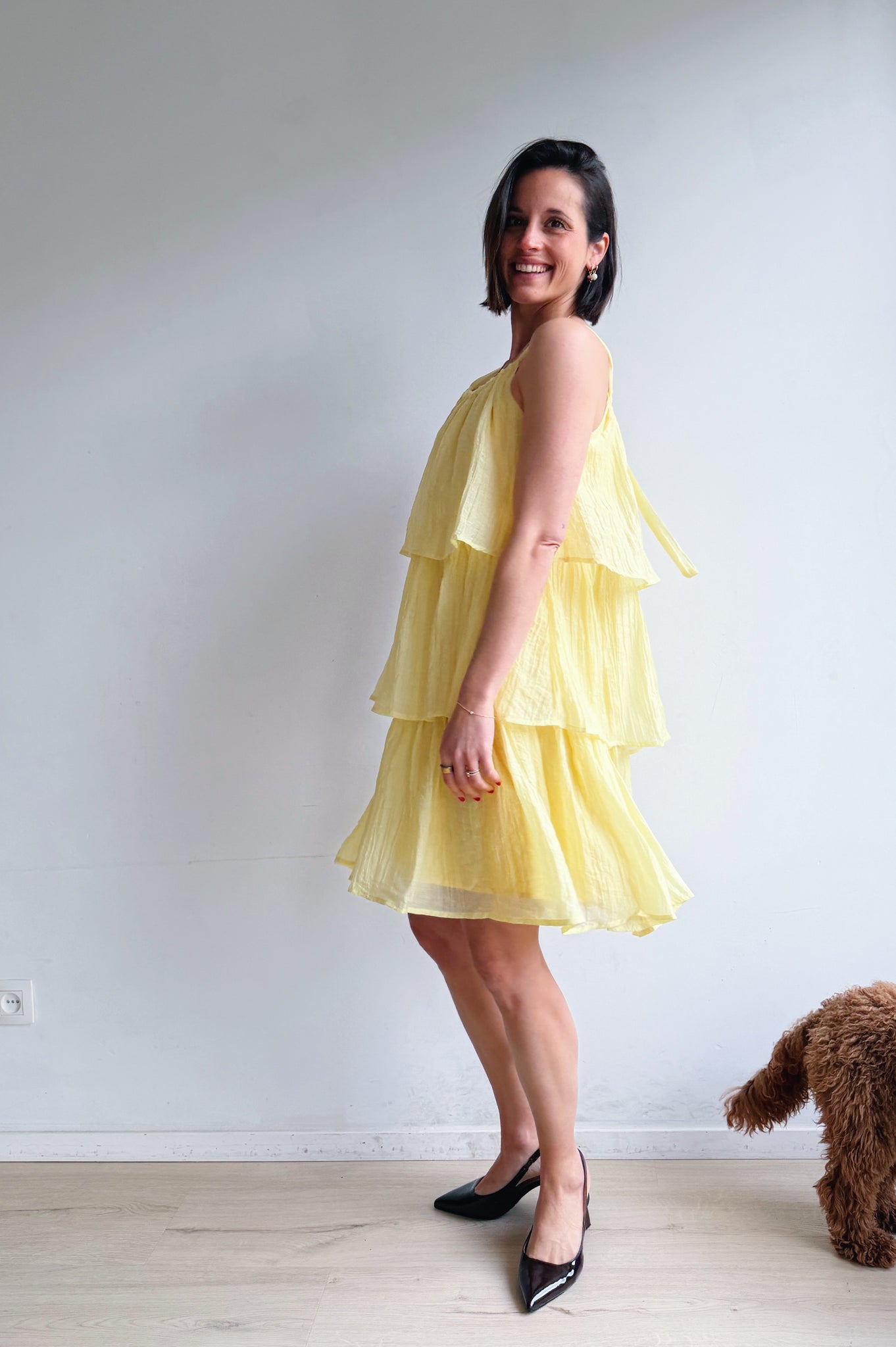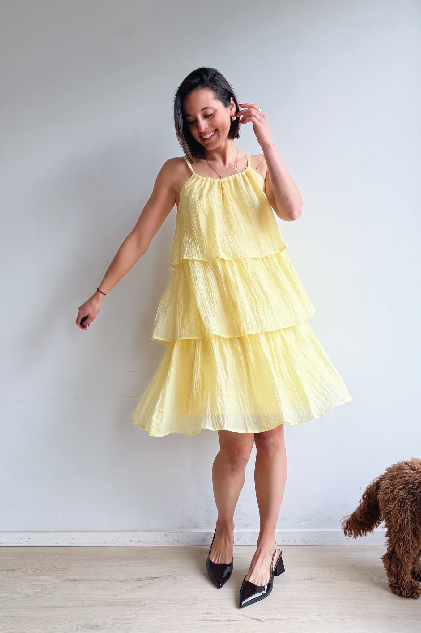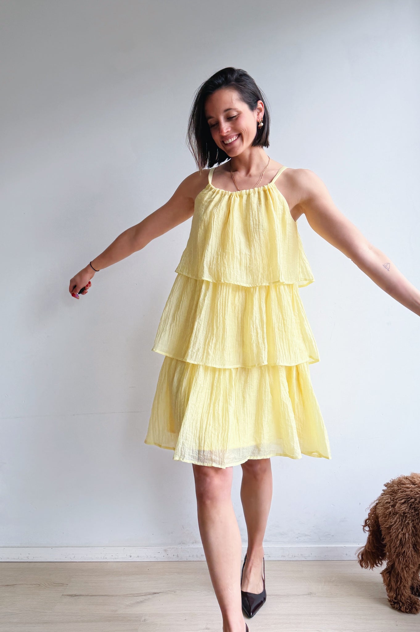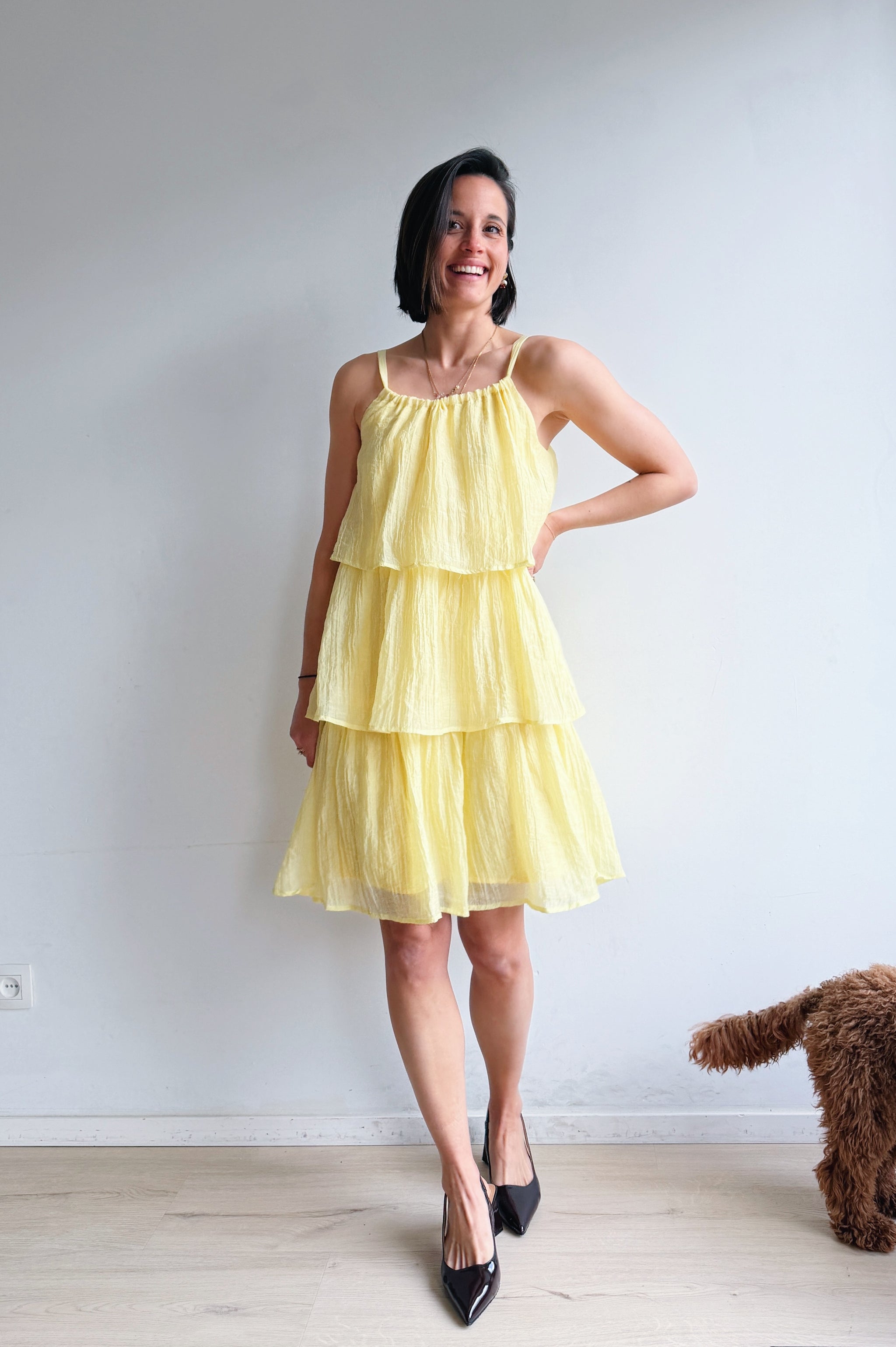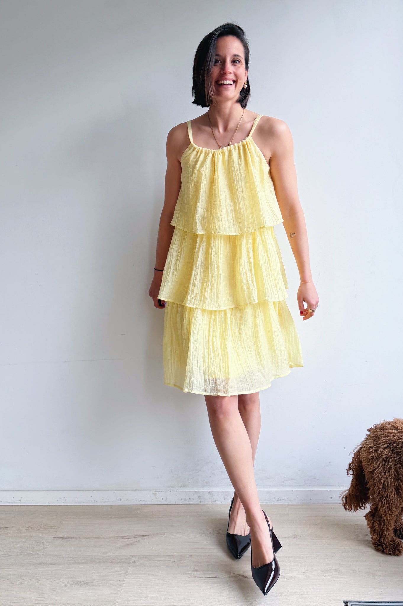 Luchtig, vrouwelijk en moeiteloos stijlvol. Deze jurk is ontworpen met speelse, gelaagde stroken die zorgen voor een vloeiende, elegante beweging bij elke stap. De lichte, ademende stof voelt comfortabel aan en maakt dit de perfecte jurk voor warmere dagen.