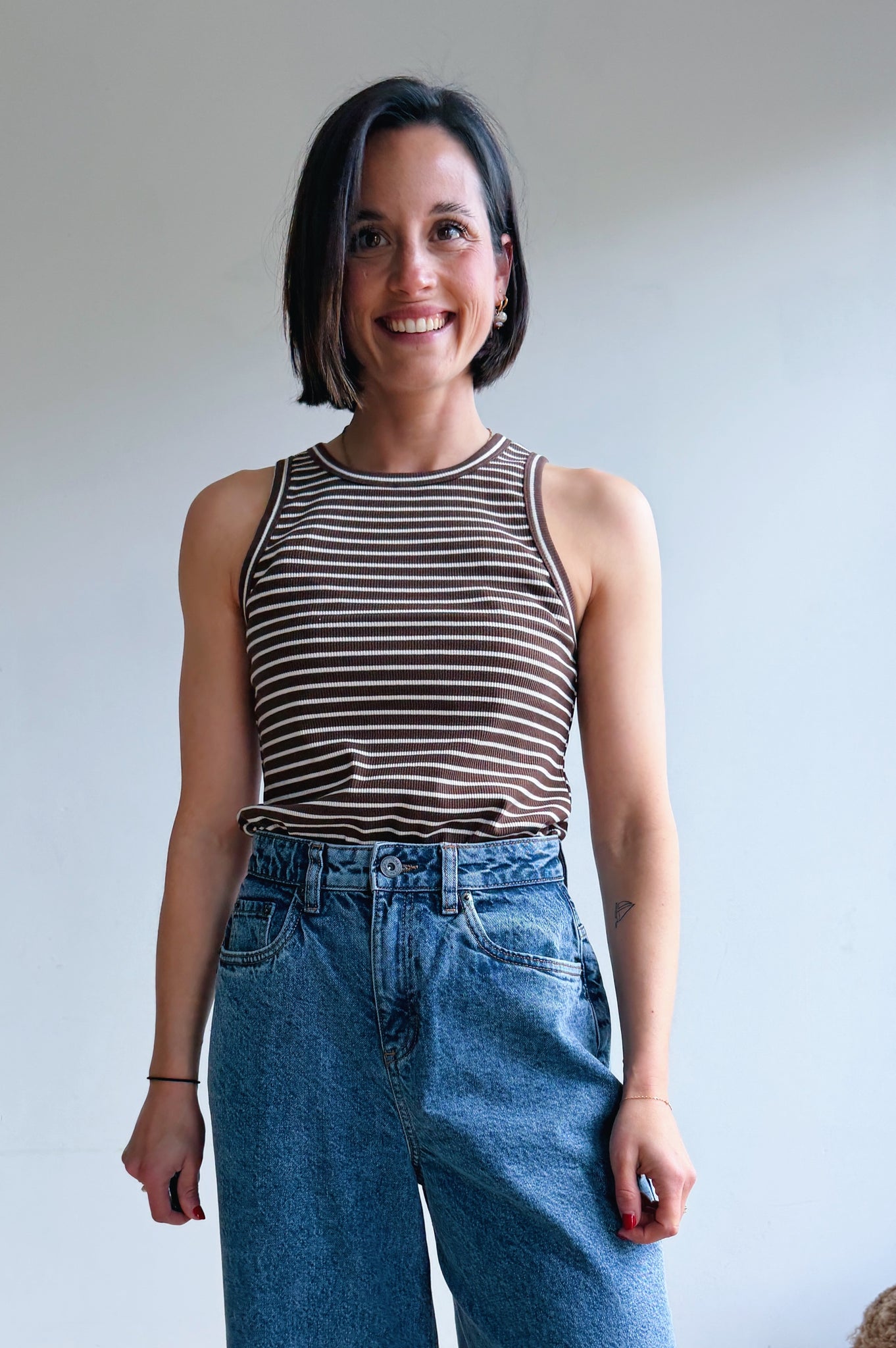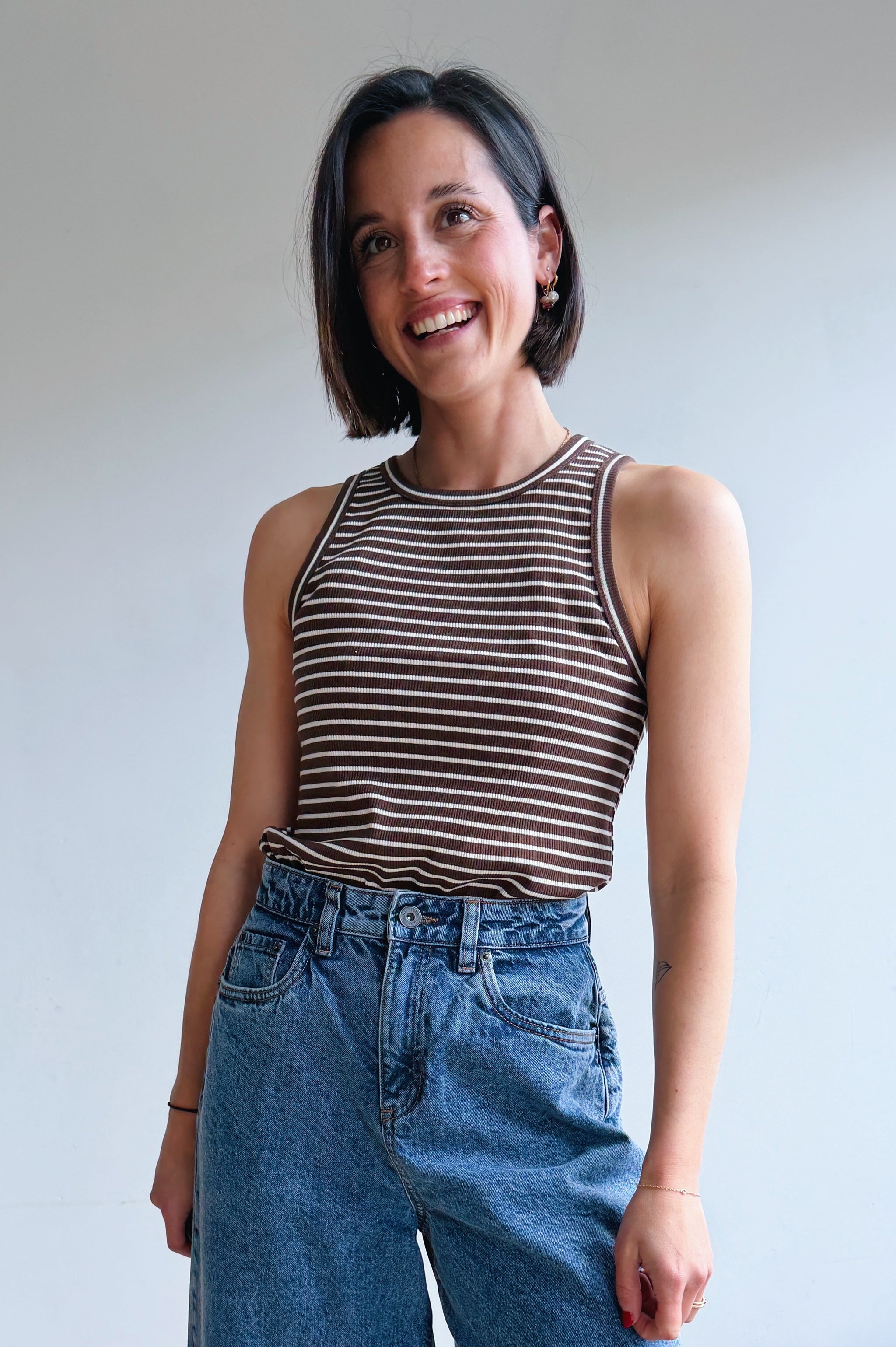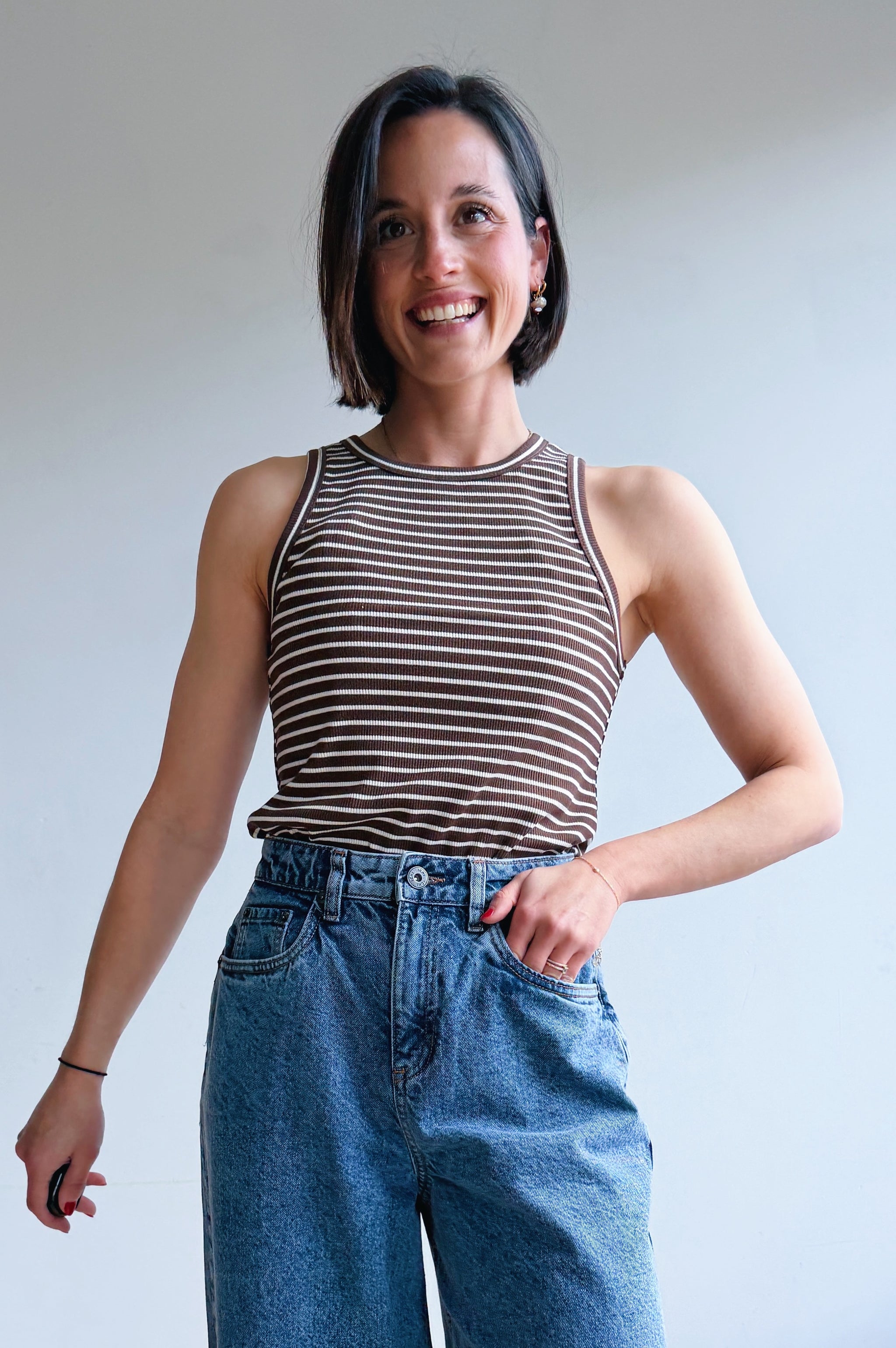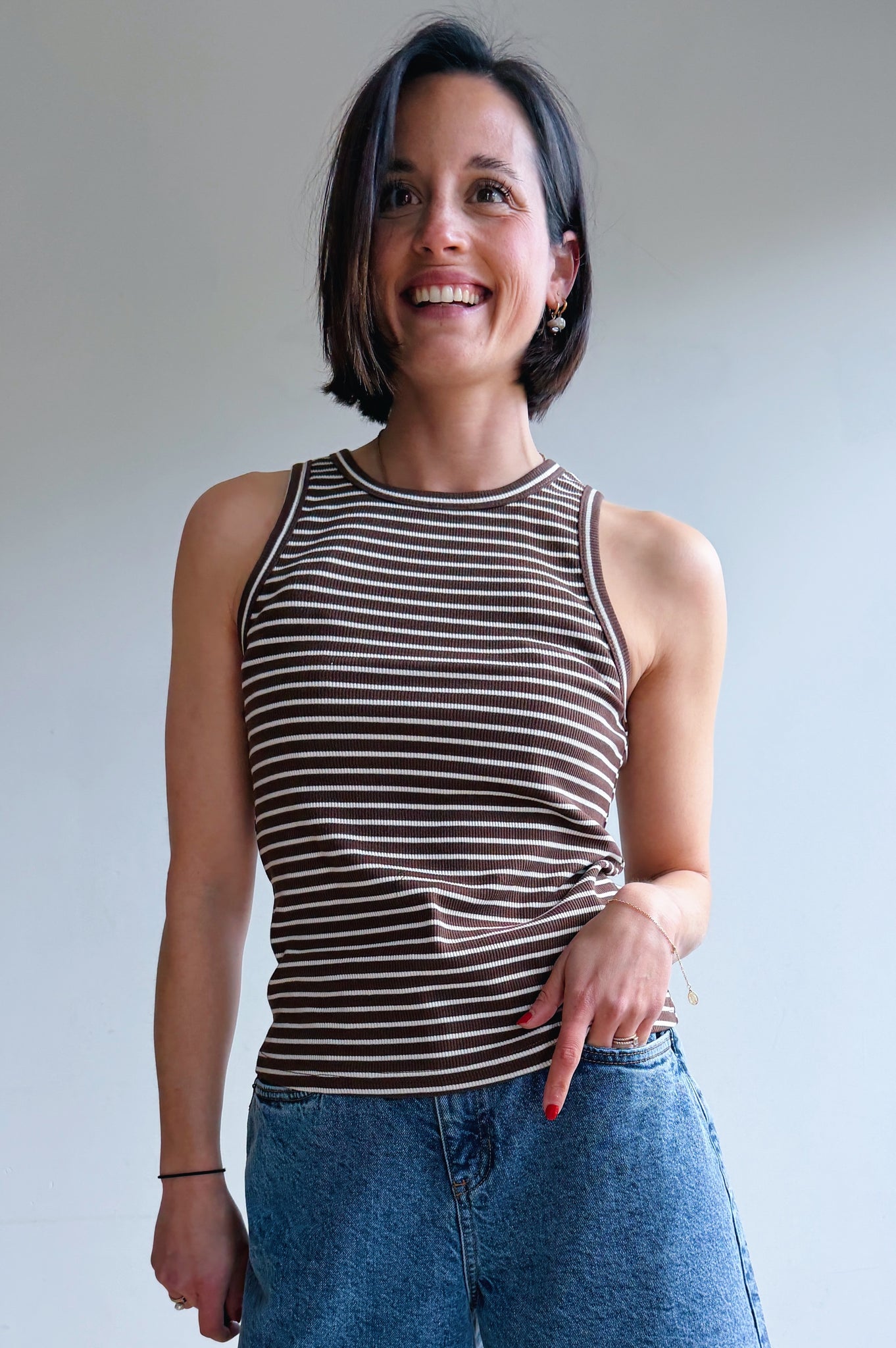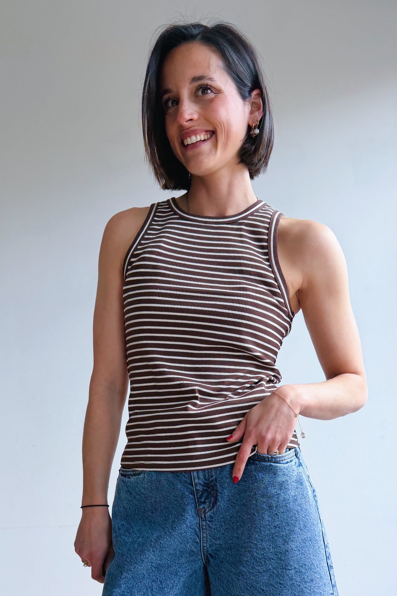Deze aansluitende top met fijne strepen in bruin en ecru heeft een sportieve en minimalistische uitstraling. De ribstof zorgt voor een mooie, comfortabele fit die het lichaam subtiel volgt.