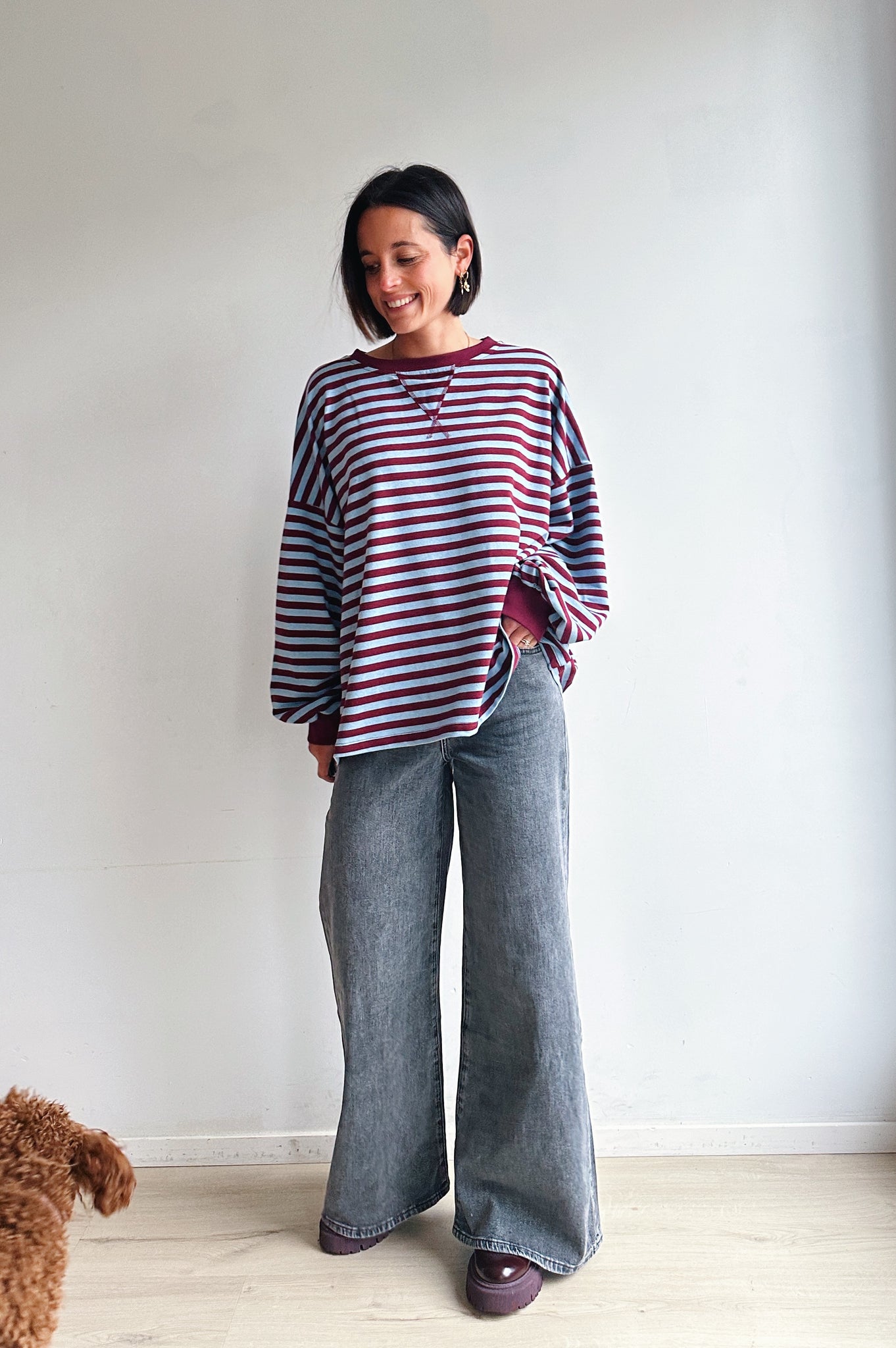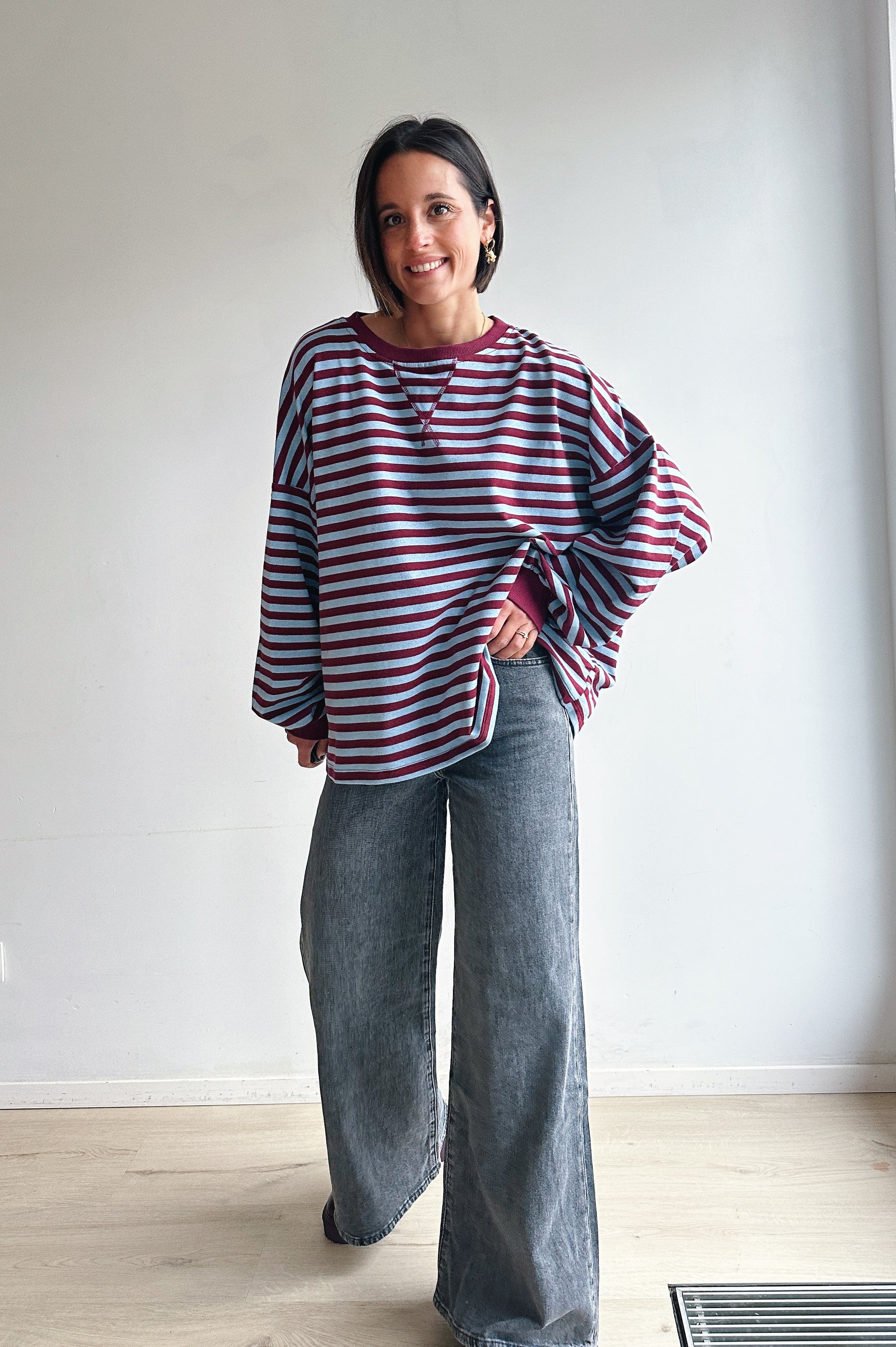 Deze gestreepte lichte sweatsers zijn zo'n easy musthaves. Beschikbaar in 3 kleurcombinaties: lichtblauw - bruin, bordeaux - marine & bordeaux licht grijs.