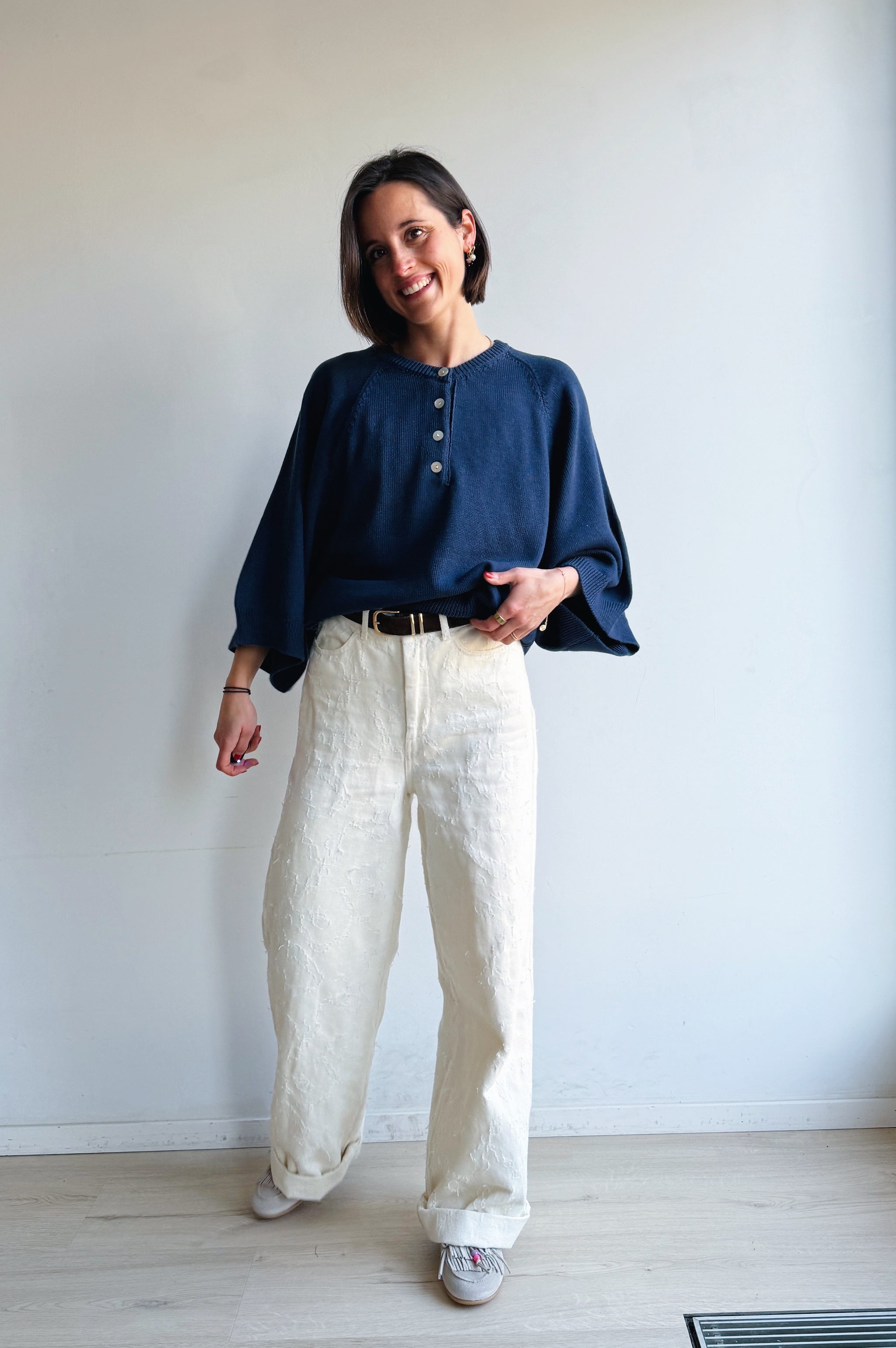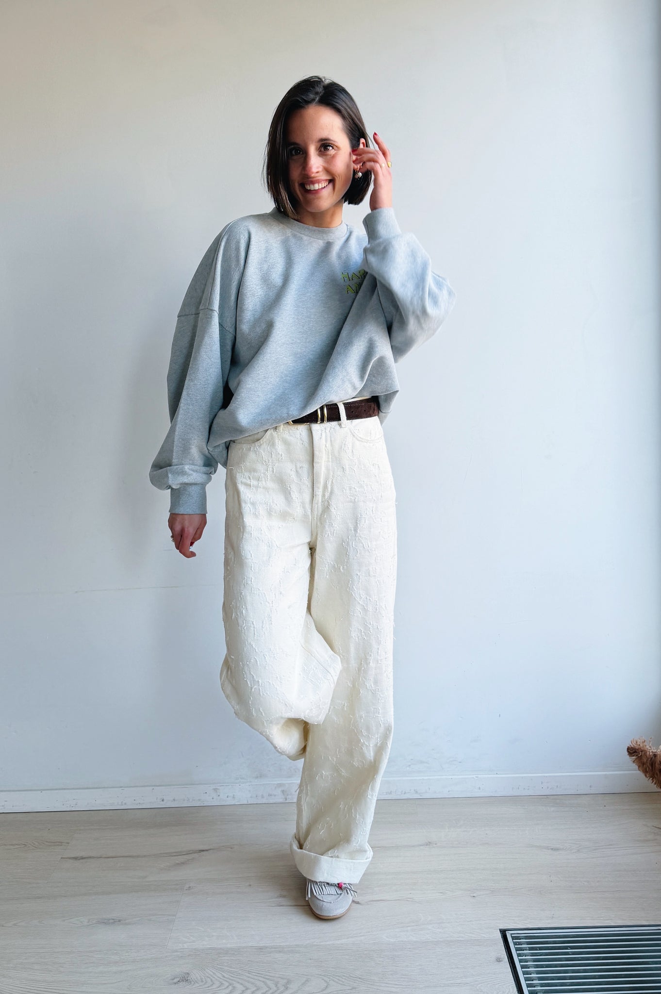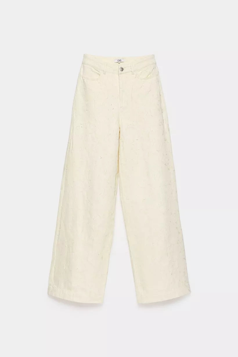 Deze ecru, wijde jeansbroek voor dames zorgt voor een statement door de opvallende structuur op de stof. Dit item heeft een hoge taille en zakken.