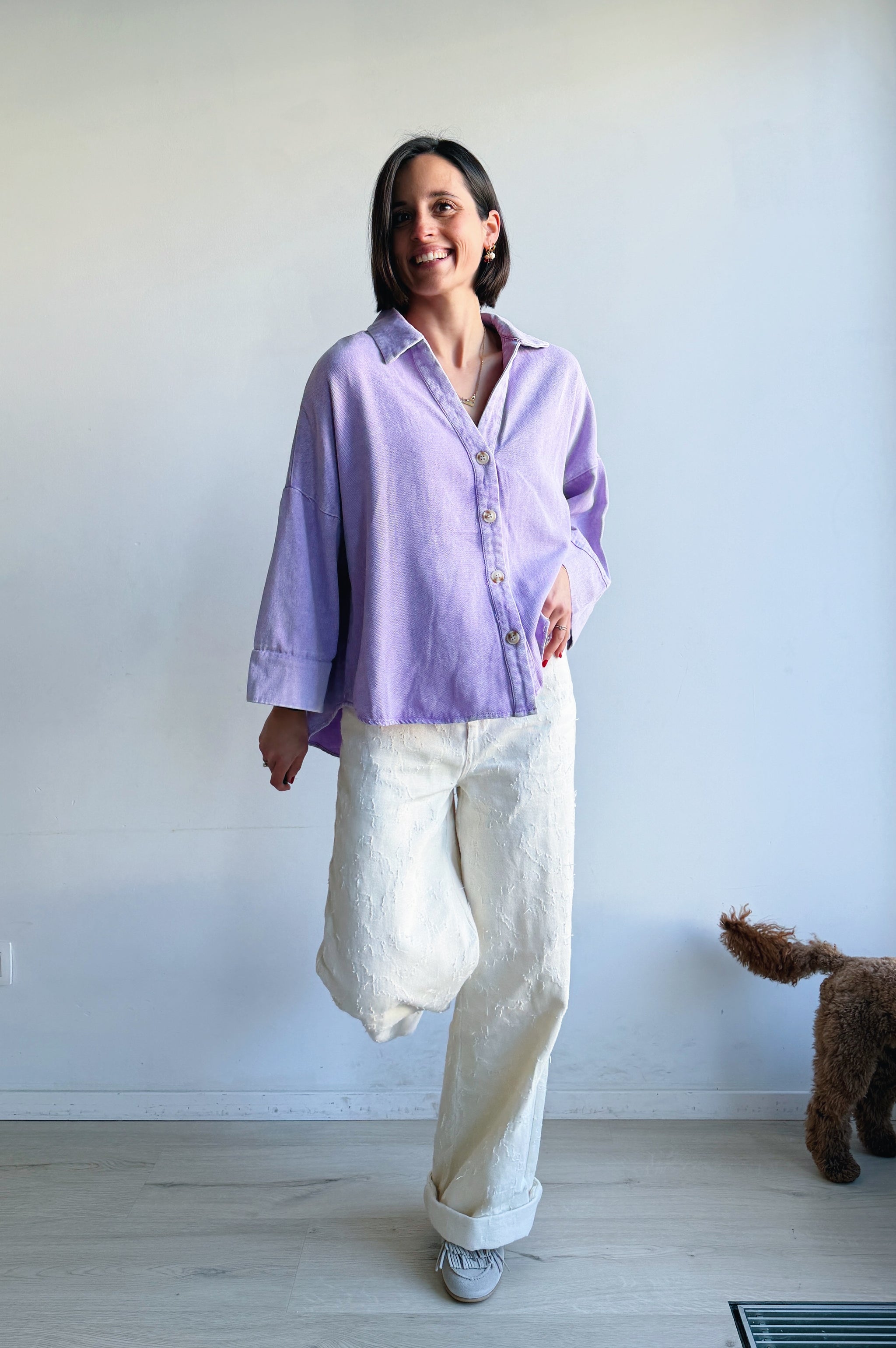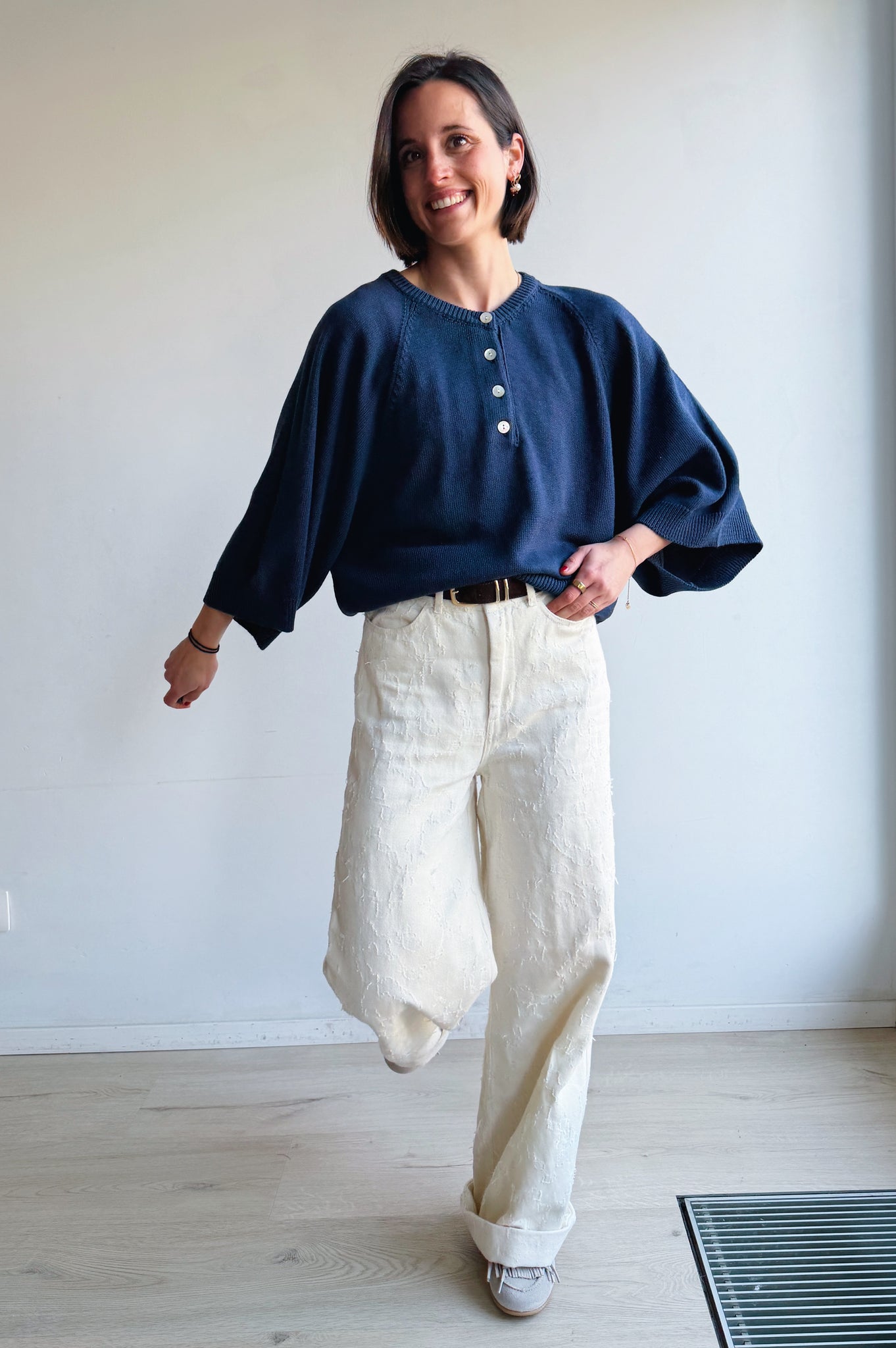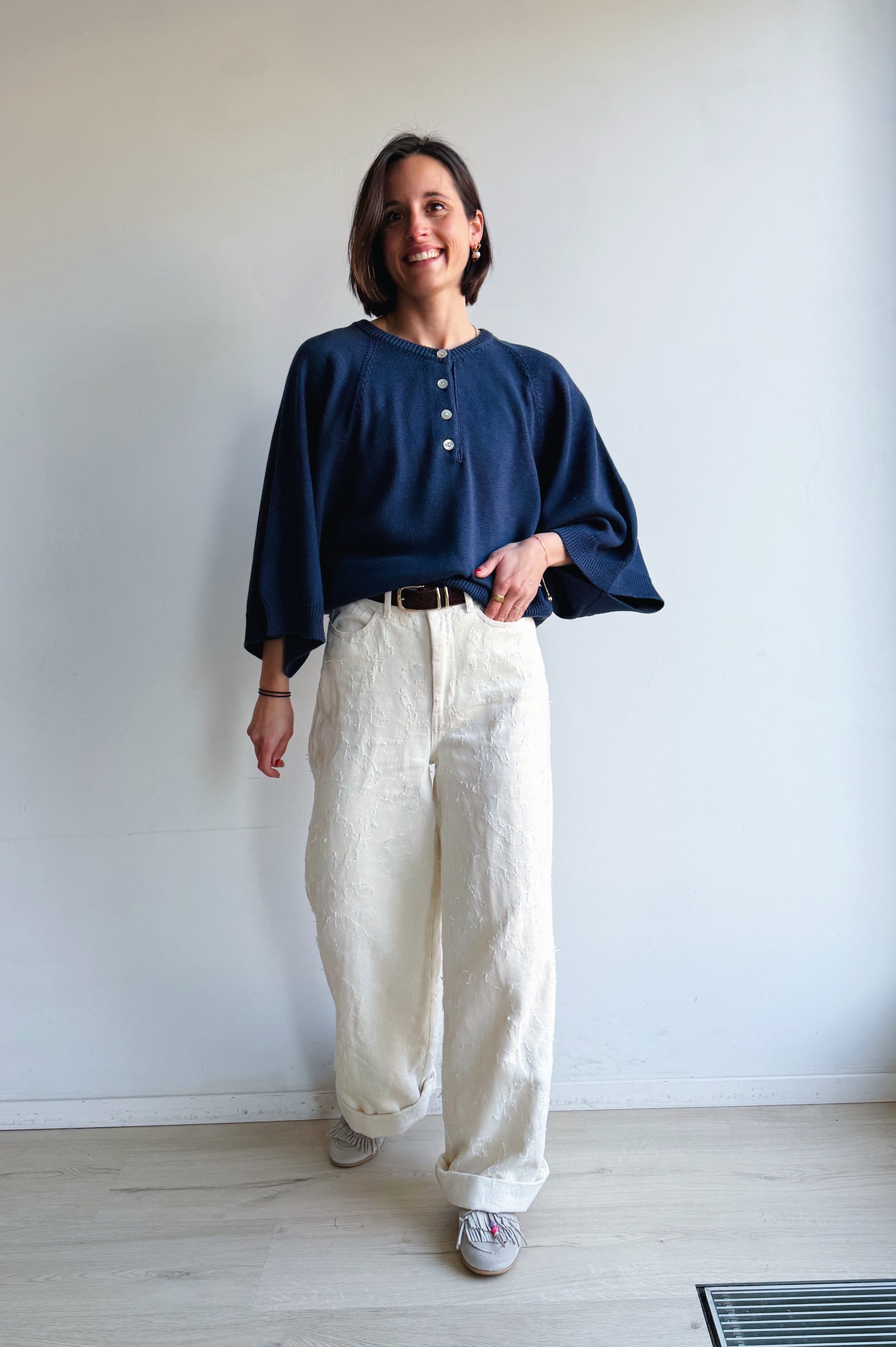 Deze ecru, wijde jeansbroek voor dames zorgt voor een statement door de opvallende structuur op de stof. Dit item heeft een hoge taille en zakken.