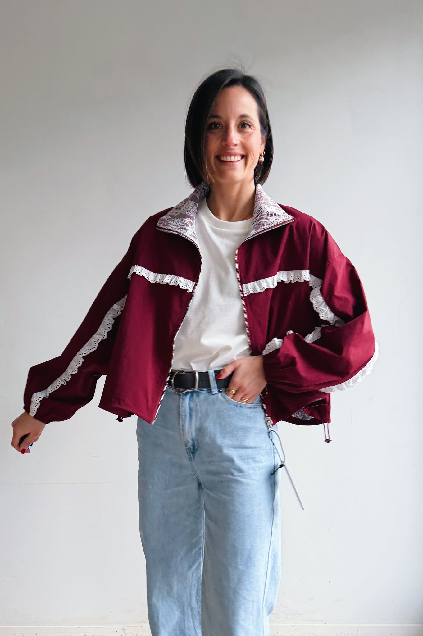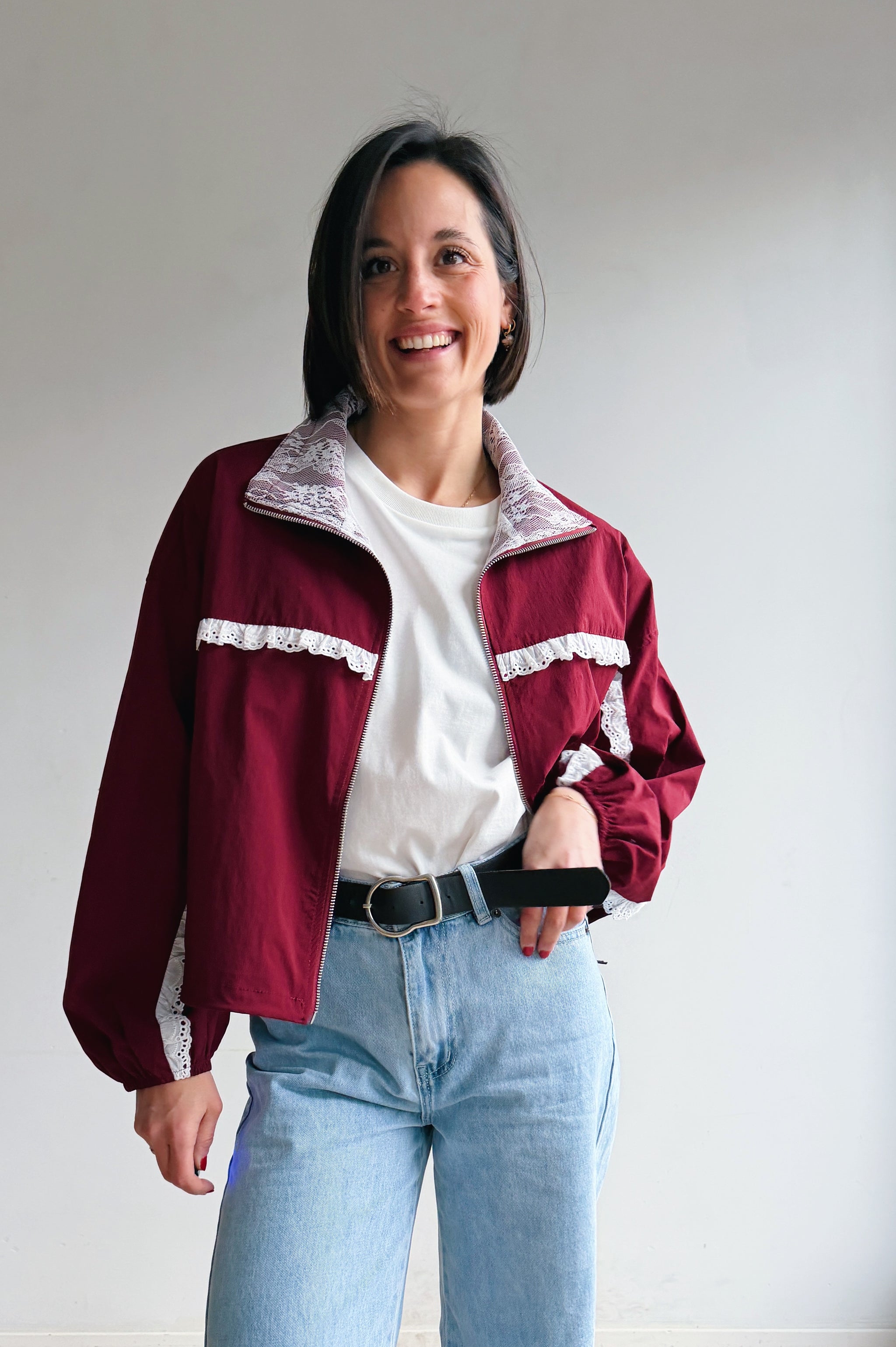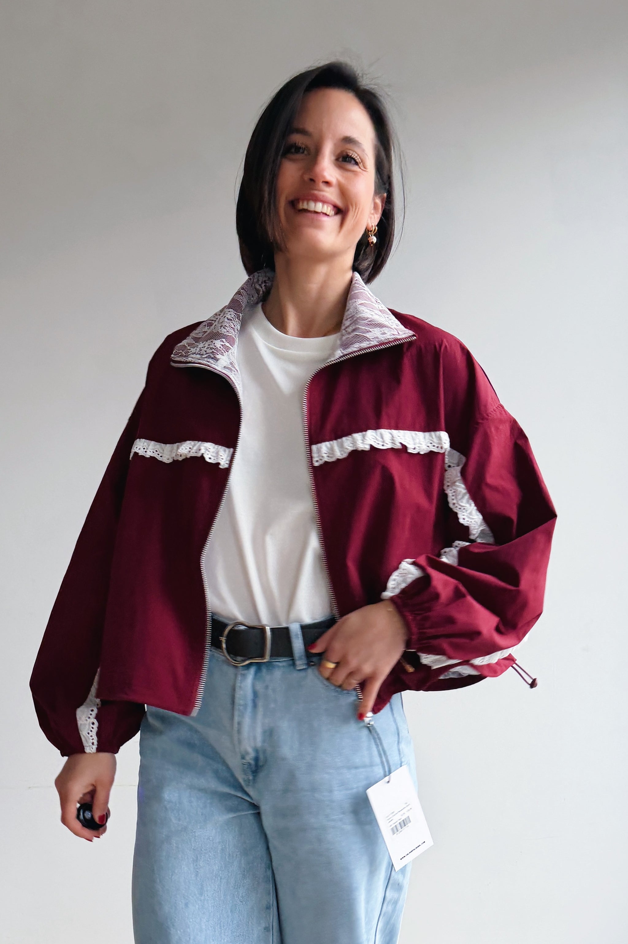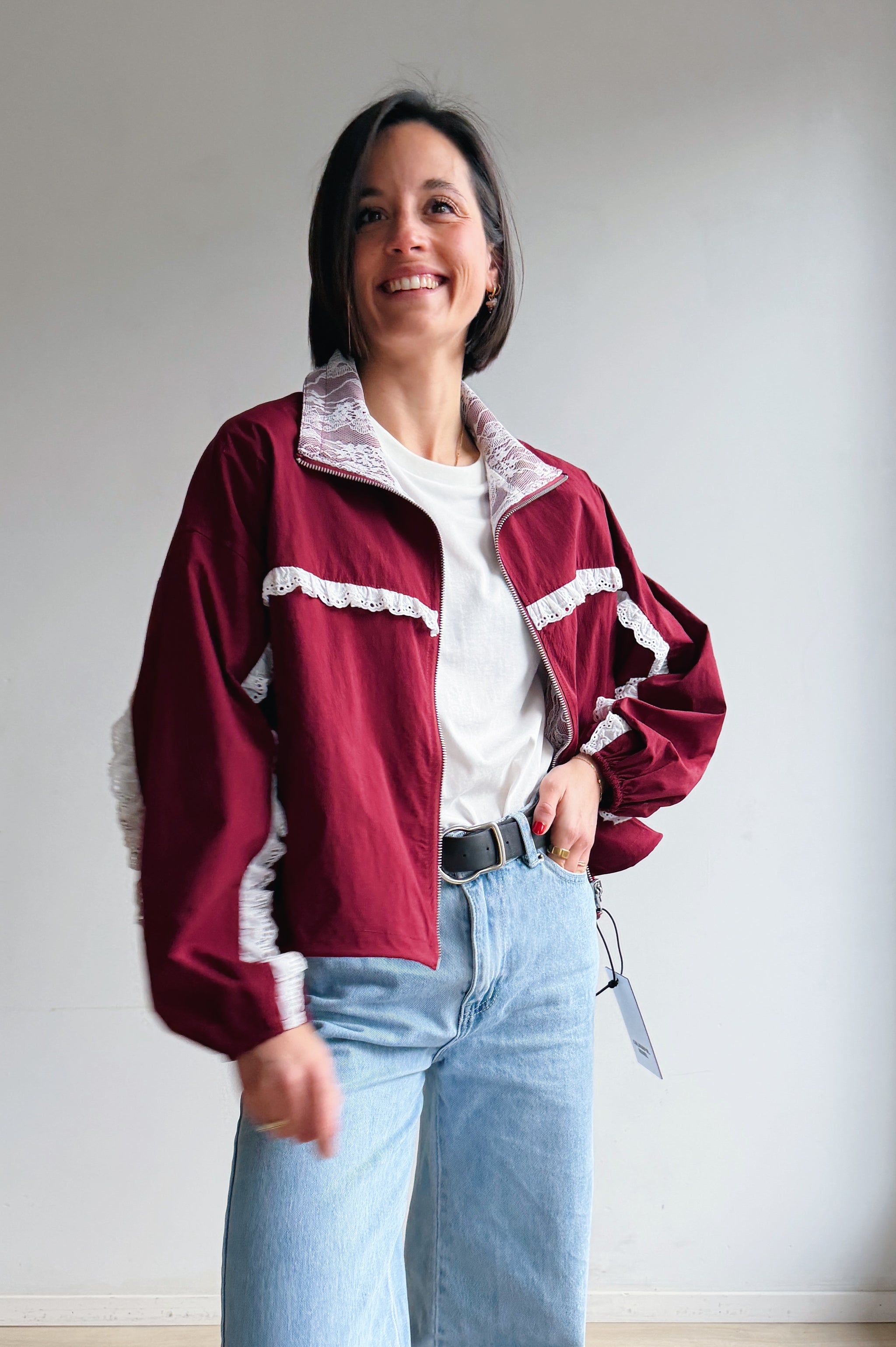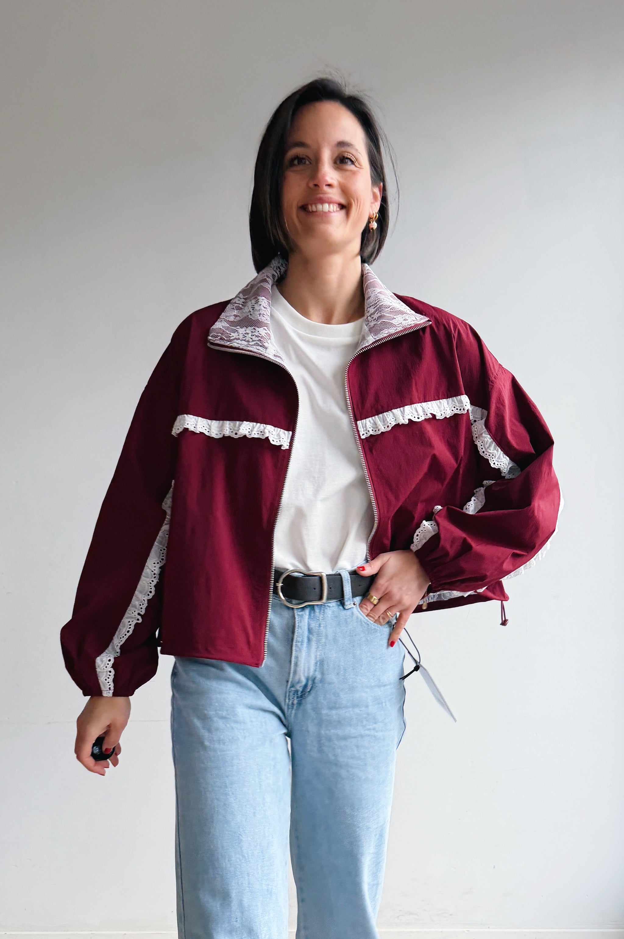 Maak een statement met dit unieke bordeaux jasje dat sportieve invloeden combineert met verfijnde details. De relaxte pasvorm en lichte stof zorgen voor een moeiteloze, comfortabele fit, terwijl de contrasterende kantafwerking een verrassend elegante touch toevoegt. De ritssluiting en subtiele afwerking geven het ontwerp een moderne uitstraling.