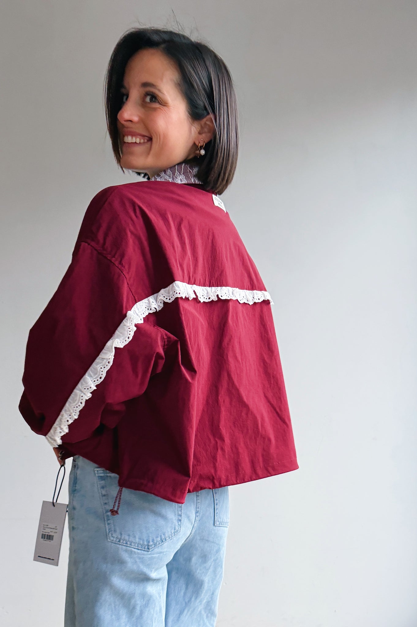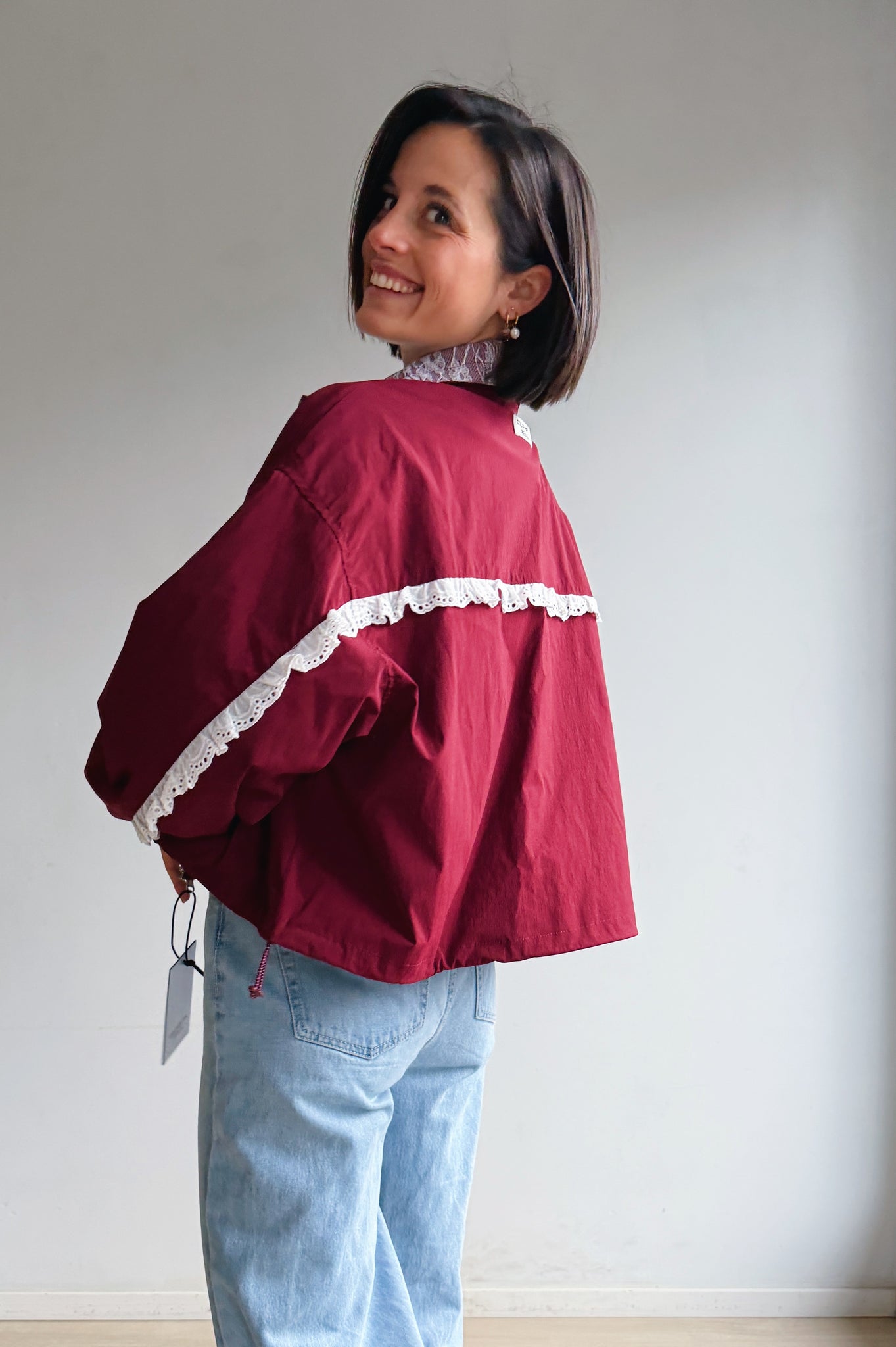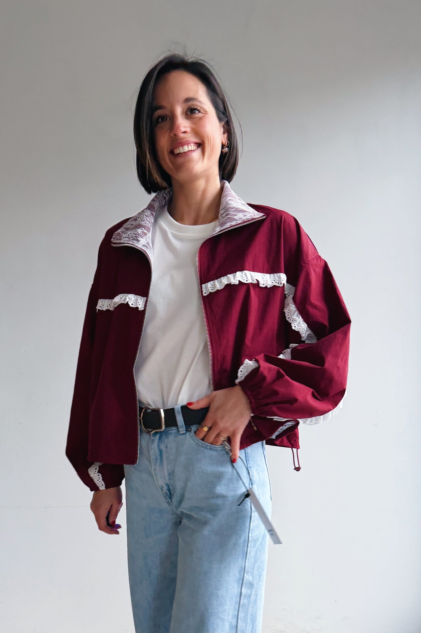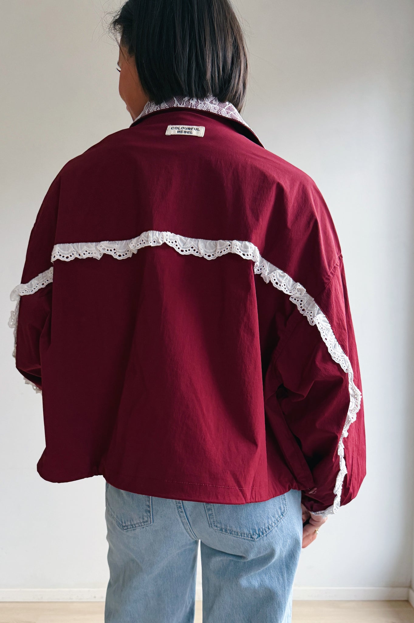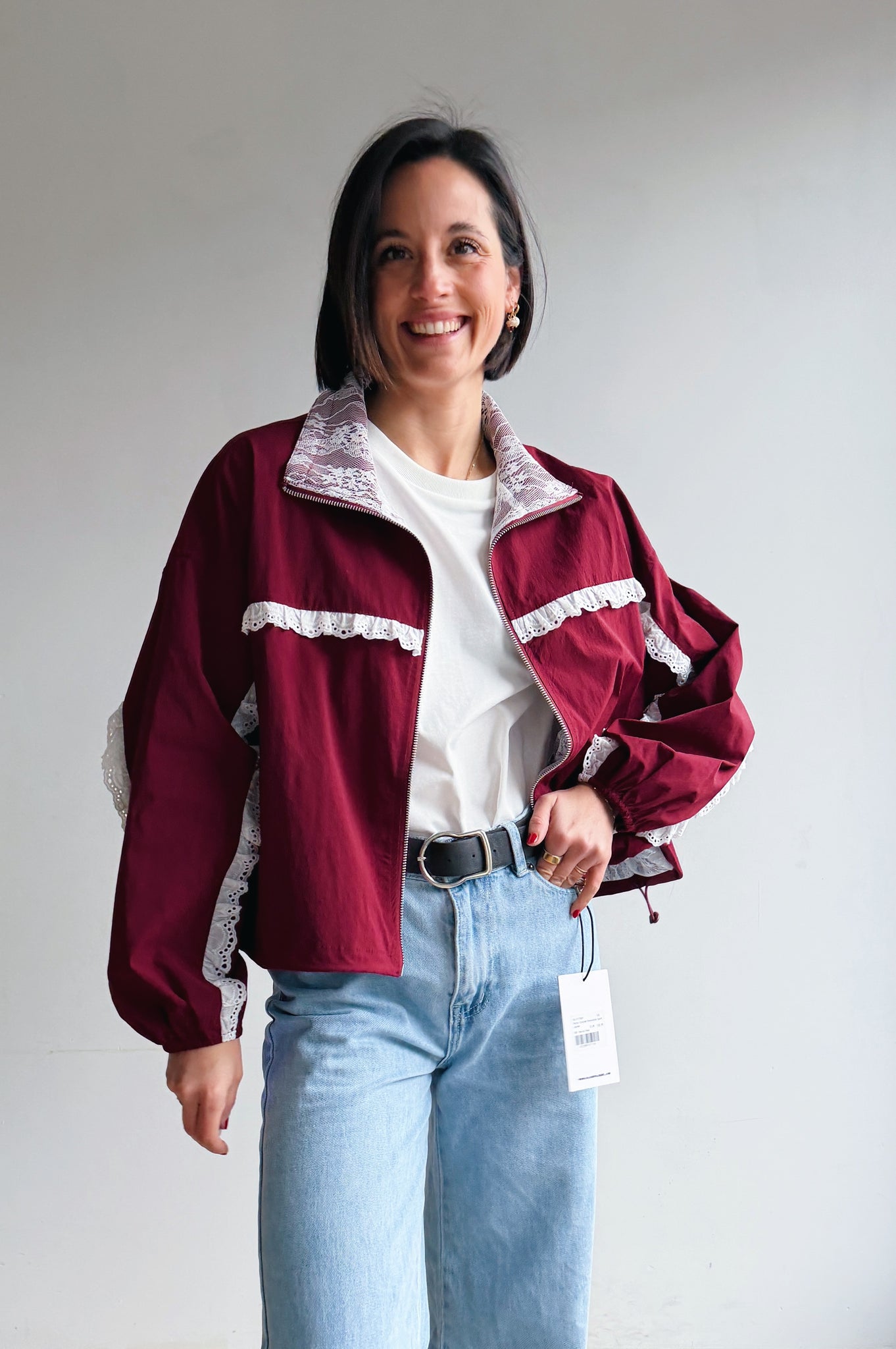 Maak een statement met dit unieke bordeaux jasje dat sportieve invloeden combineert met verfijnde details. De relaxte pasvorm en lichte stof zorgen voor een moeiteloze, comfortabele fit, terwijl de contrasterende kantafwerking een verrassend elegante touch toevoegt. De ritssluiting en subtiele afwerking geven het ontwerp een moderne uitstraling.