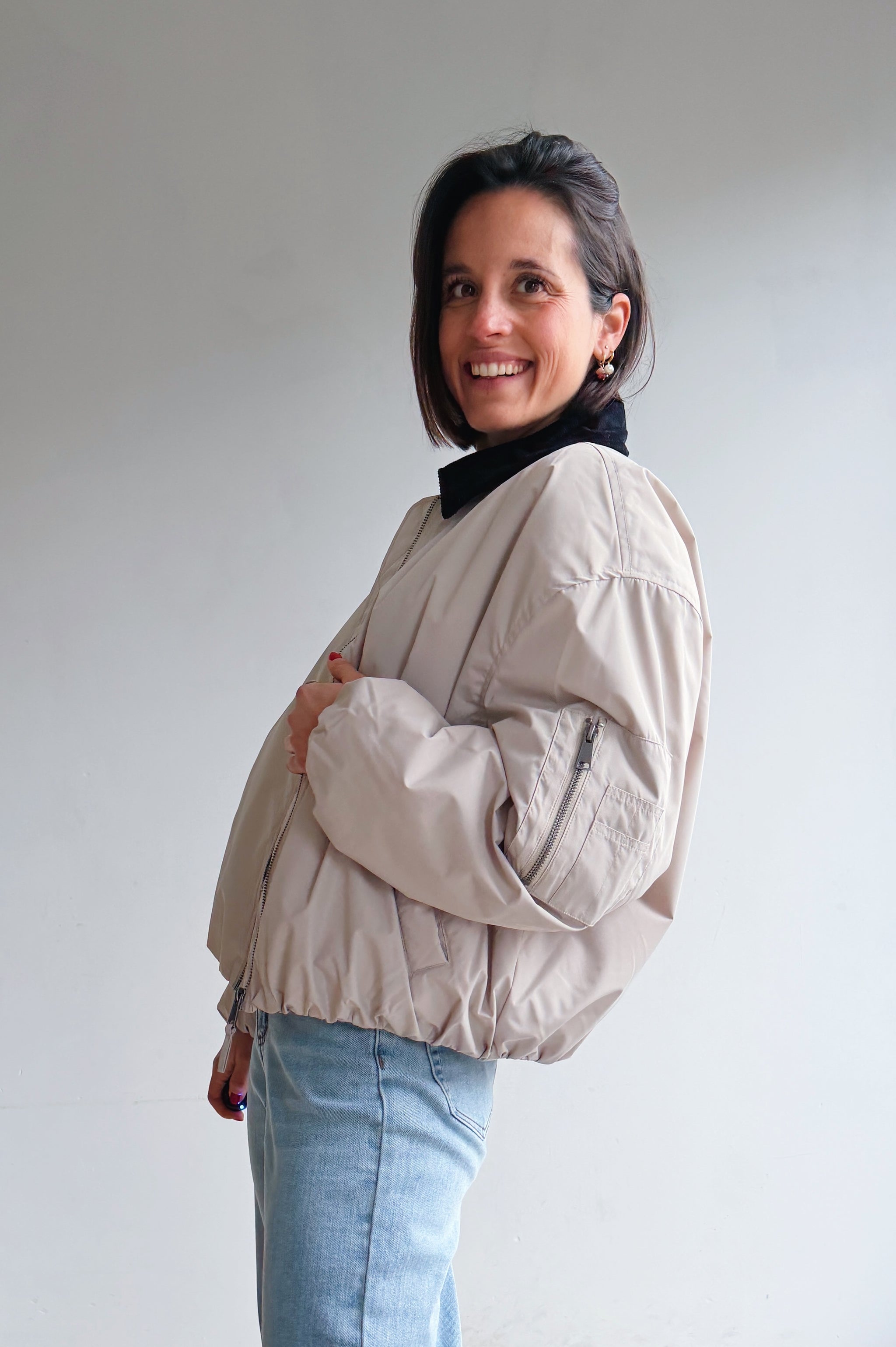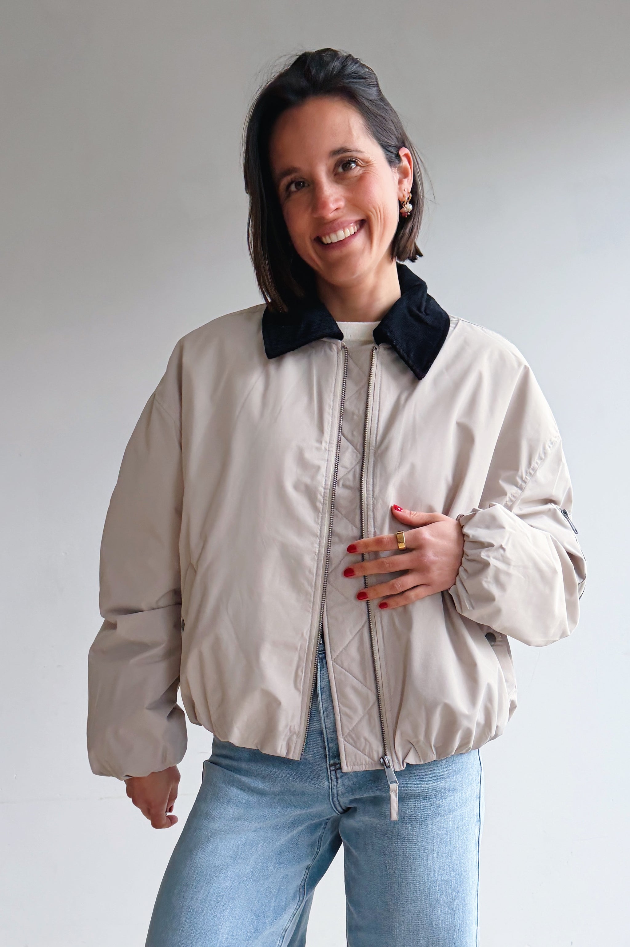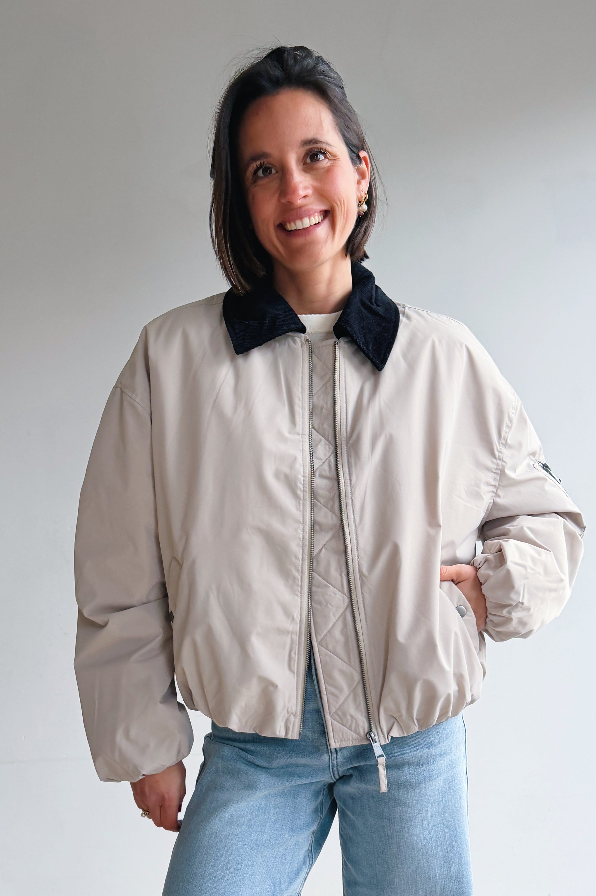 Deze bomberjack combineert moeiteloos comfort met een moderne, stijlvolle uitstraling. Het model heeft een licht oversized fit en een elastische zoom aan de onderzijde en mouwen voor een speels, volumineus effect. De contrasterende corduroy kraag geeft de jas een eigentijdse twist en zorgt voor een subtiel statement.