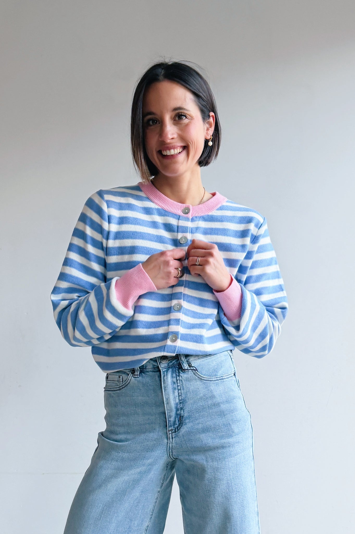 Deze gilet heeft een speelse en frisse uitstraling dankzij de brede geel en witte strepen. De contrasterende blauwe boord aan de hals en mouwen voegt een onverwacht accent toe, wat het geheel een moderne twist geeft. Het ontwerp is afgewerkt met knopen aan de voorkant en voelt licht en comfortabel aan. Perfect om zowel dichtgeknoopt als open te dragen, over een simpele top of gecombineerd met een rok of broek.