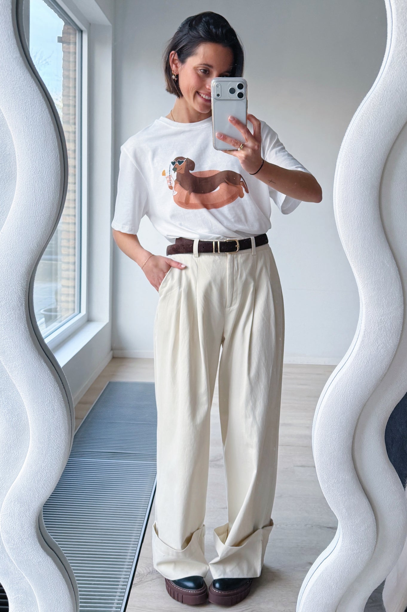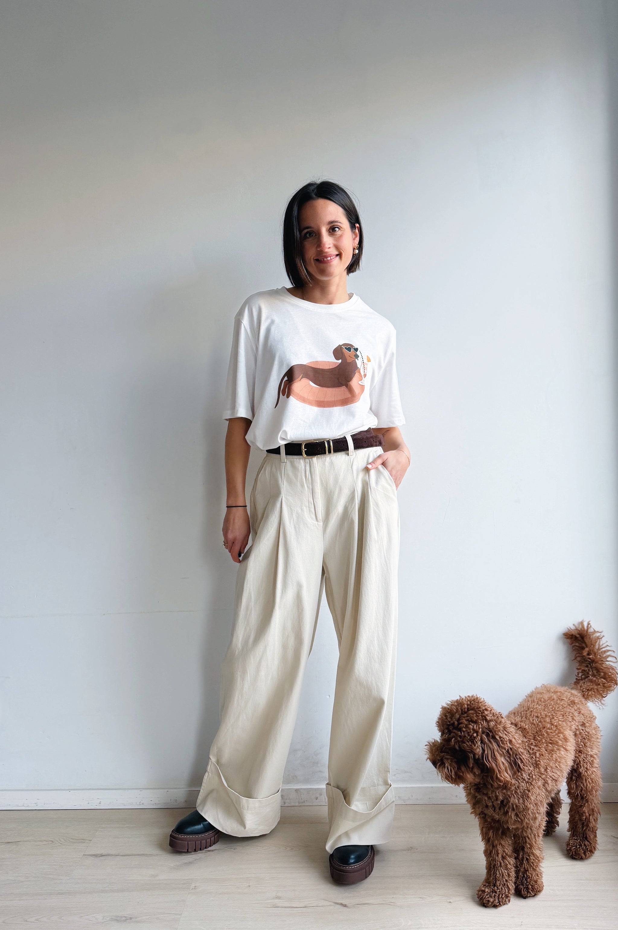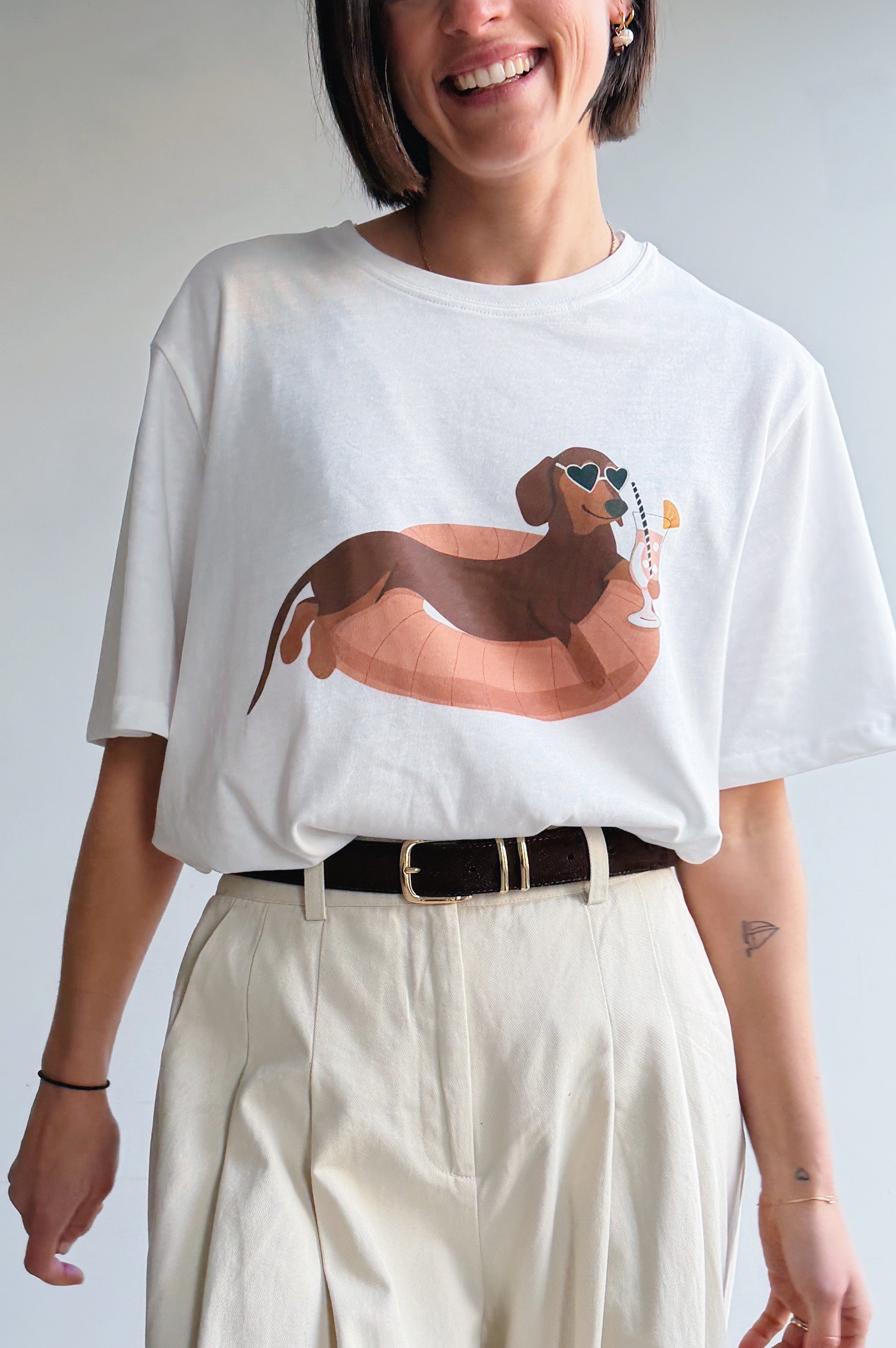 Een speels en comfortabel t-shirt met een vrolijke tekening die meteen een glimlach oproept. De losse, oversized fit en zachte katoenkwaliteit zorgen voor een relaxed draaggevoel en maken dit shirt perfect voor elke dag. De grappige teckle geeft de t-shirt een leuke, unieke twist zonder overheersend te zijn, waardoor je het makkelijk combineert met jeans, een pantalon of rok.