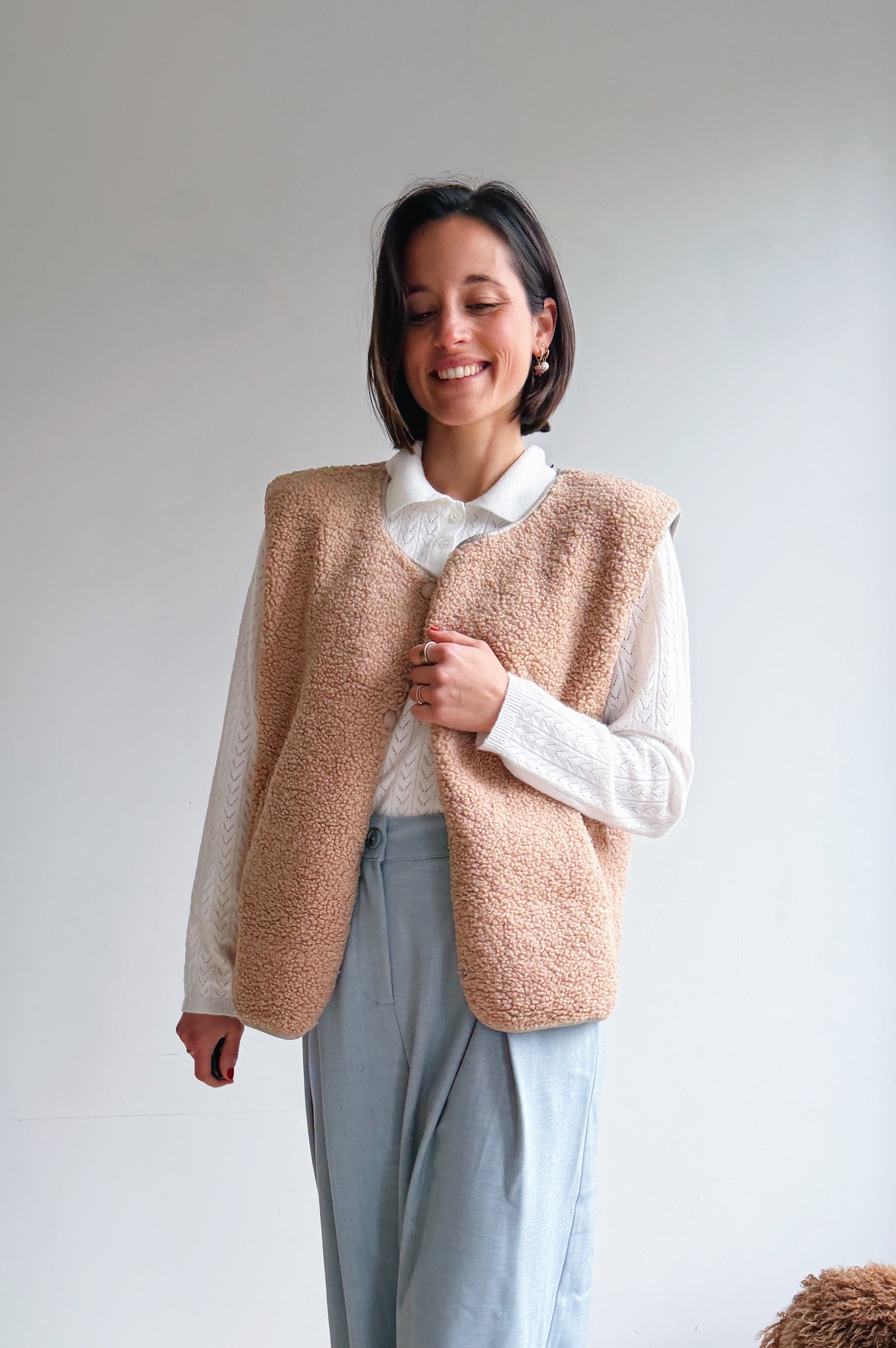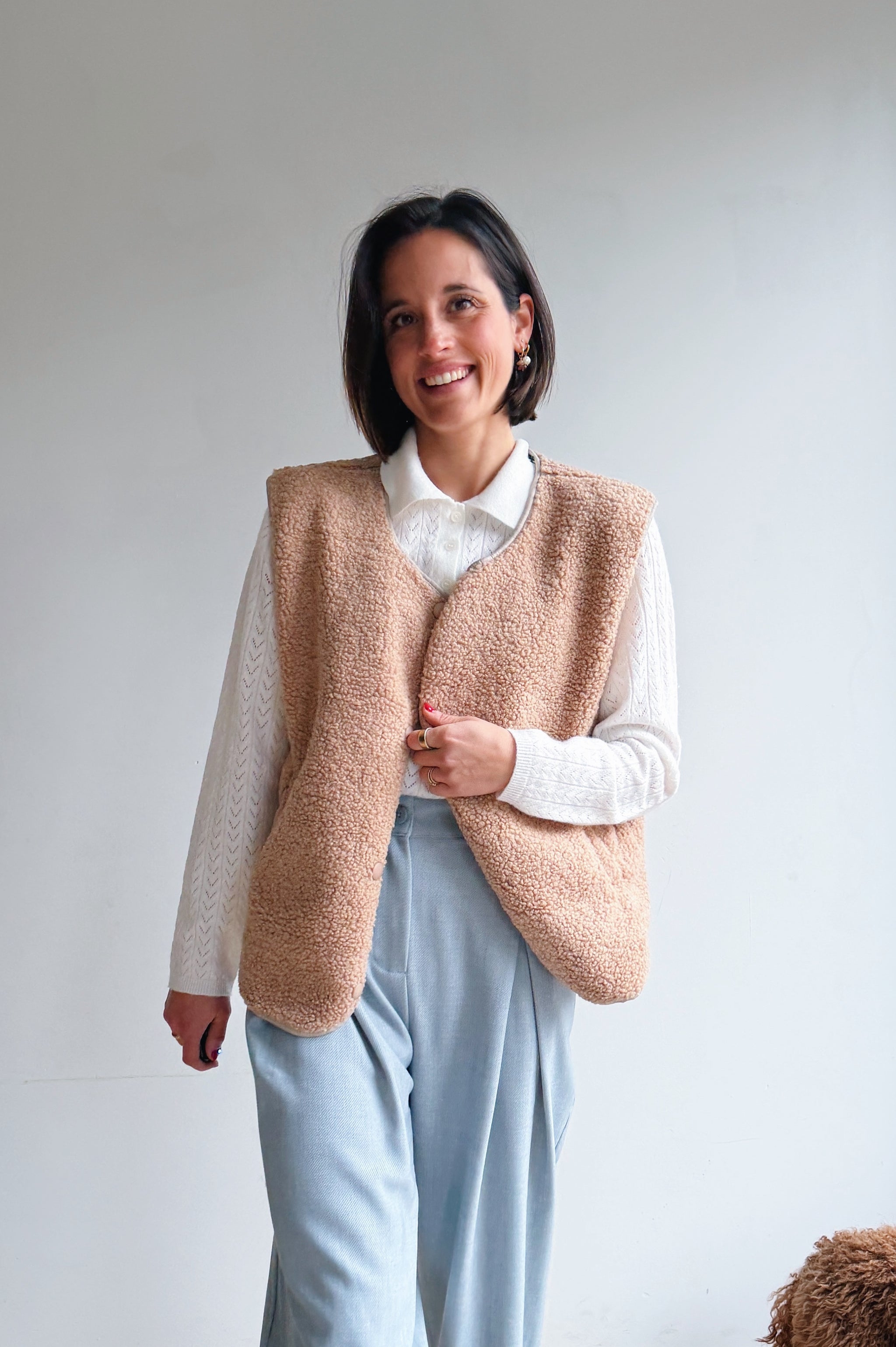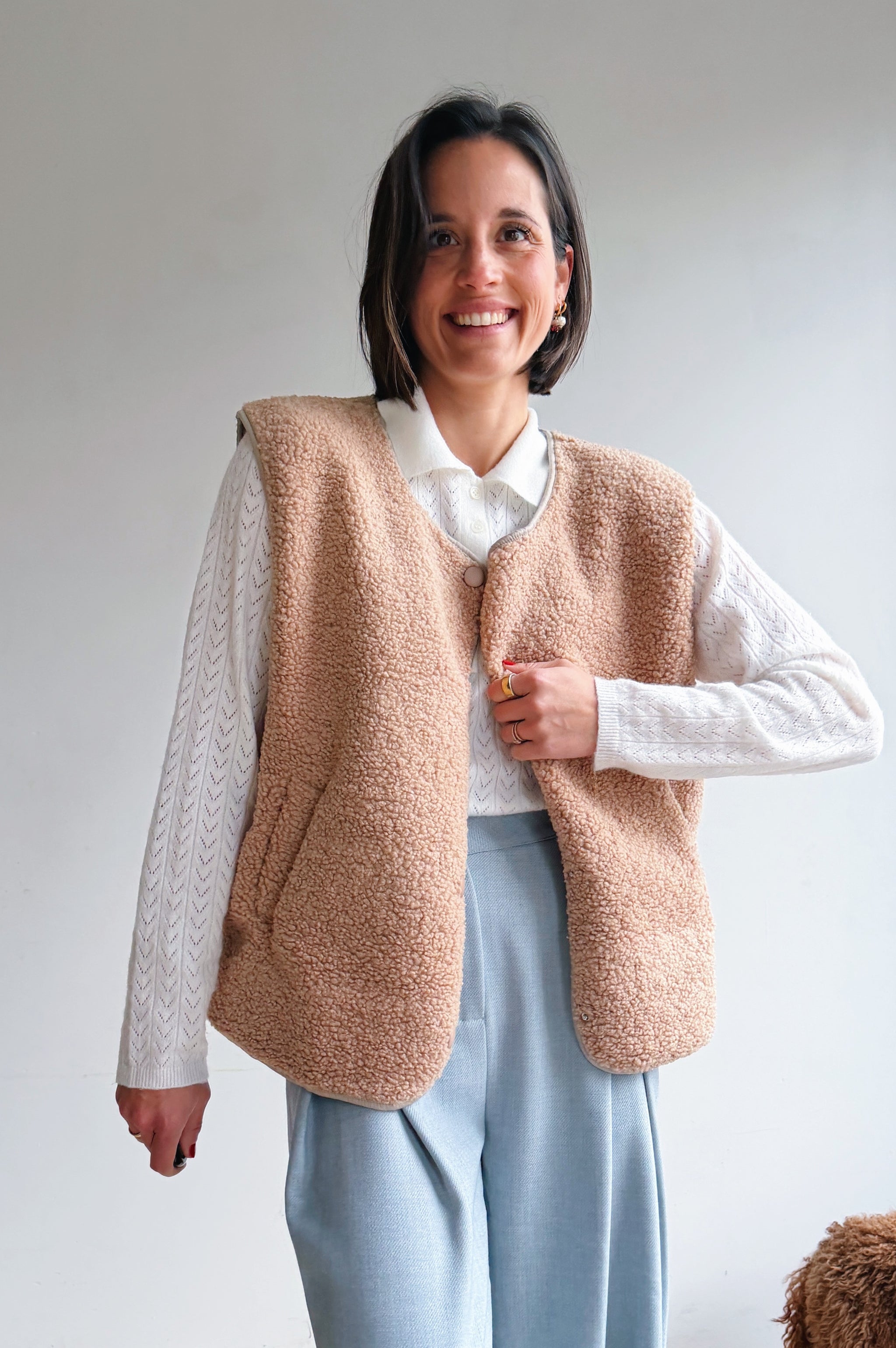 De beige/camel kleurige teddy is een heerlijk zacht en cozy item dat meteen warmte en extra laagje toevoegt aan je outfit. De teddy stof geeft een nonchalante maar modieuze uitstraling en de tijdloze tint maakt hem makkelijk te combineren. Met de drukknopen kan je hem open of dicht dragen, afhankelijk van de look die je wil creëren. De rechte, iets boxy pasvorm zorgt ervoor dat hij comfortabel zit en een moderne, casual vibe heeft. Perfect om te dragen over een trui of t-shirt, en ideaal voor frisse dagen waarop je je toch stijlvol wil voelen.