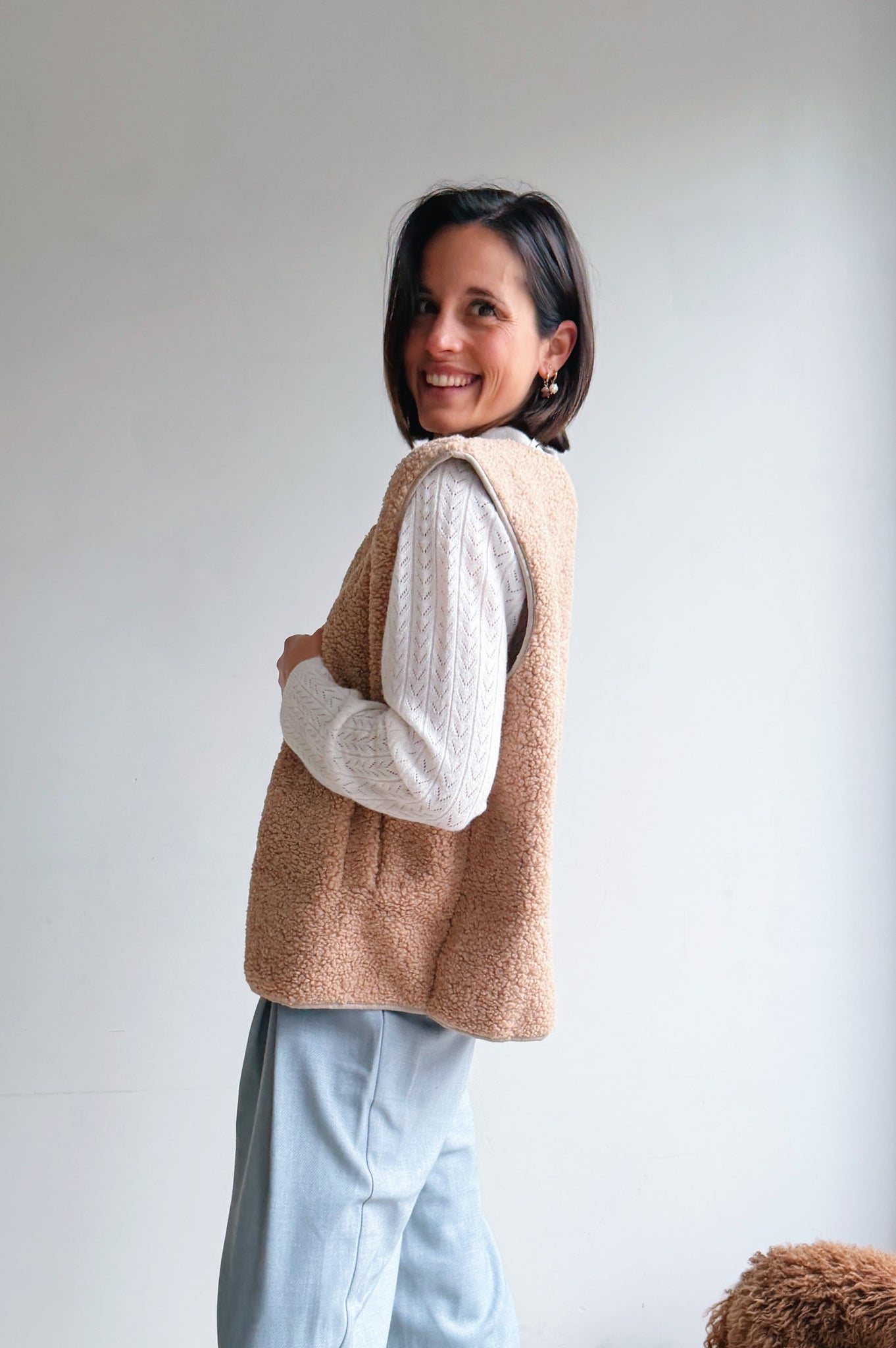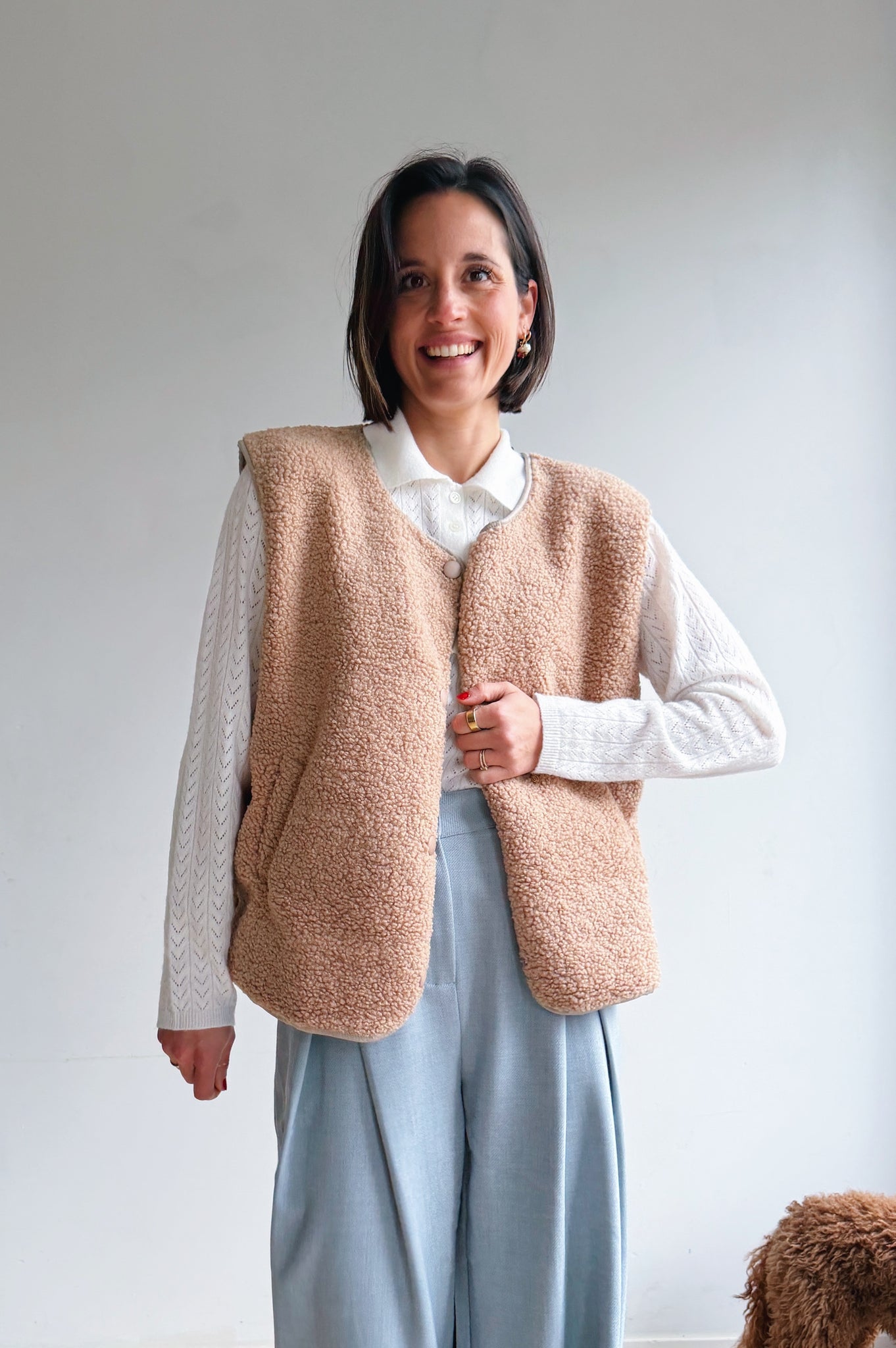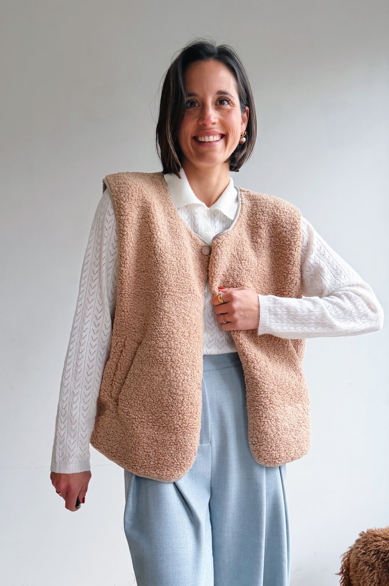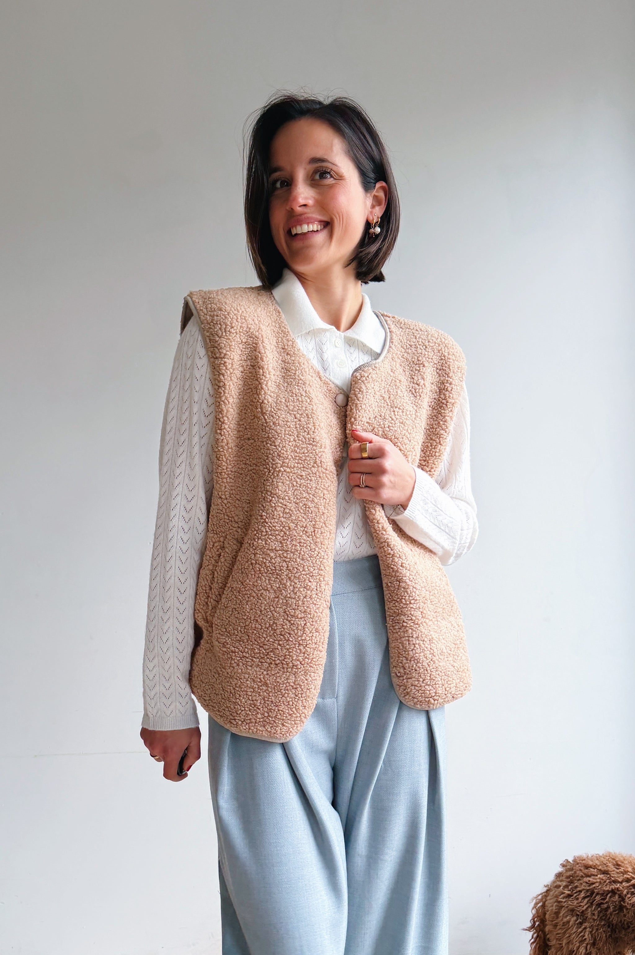 De beige/camel kleurige teddy is een heerlijk zacht en cozy item dat meteen warmte en extra laagje toevoegt aan je outfit. De teddy stof geeft een nonchalante maar modieuze uitstraling en de tijdloze tint maakt hem makkelijk te combineren. Met de drukknopen kan je hem open of dicht dragen, afhankelijk van de look die je wil creëren. De rechte, iets boxy pasvorm zorgt ervoor dat hij comfortabel zit en een moderne, casual vibe heeft. Perfect om te dragen over een trui of t-shirt, en ideaal voor frisse dagen waarop je je toch stijlvol wil voelen.
