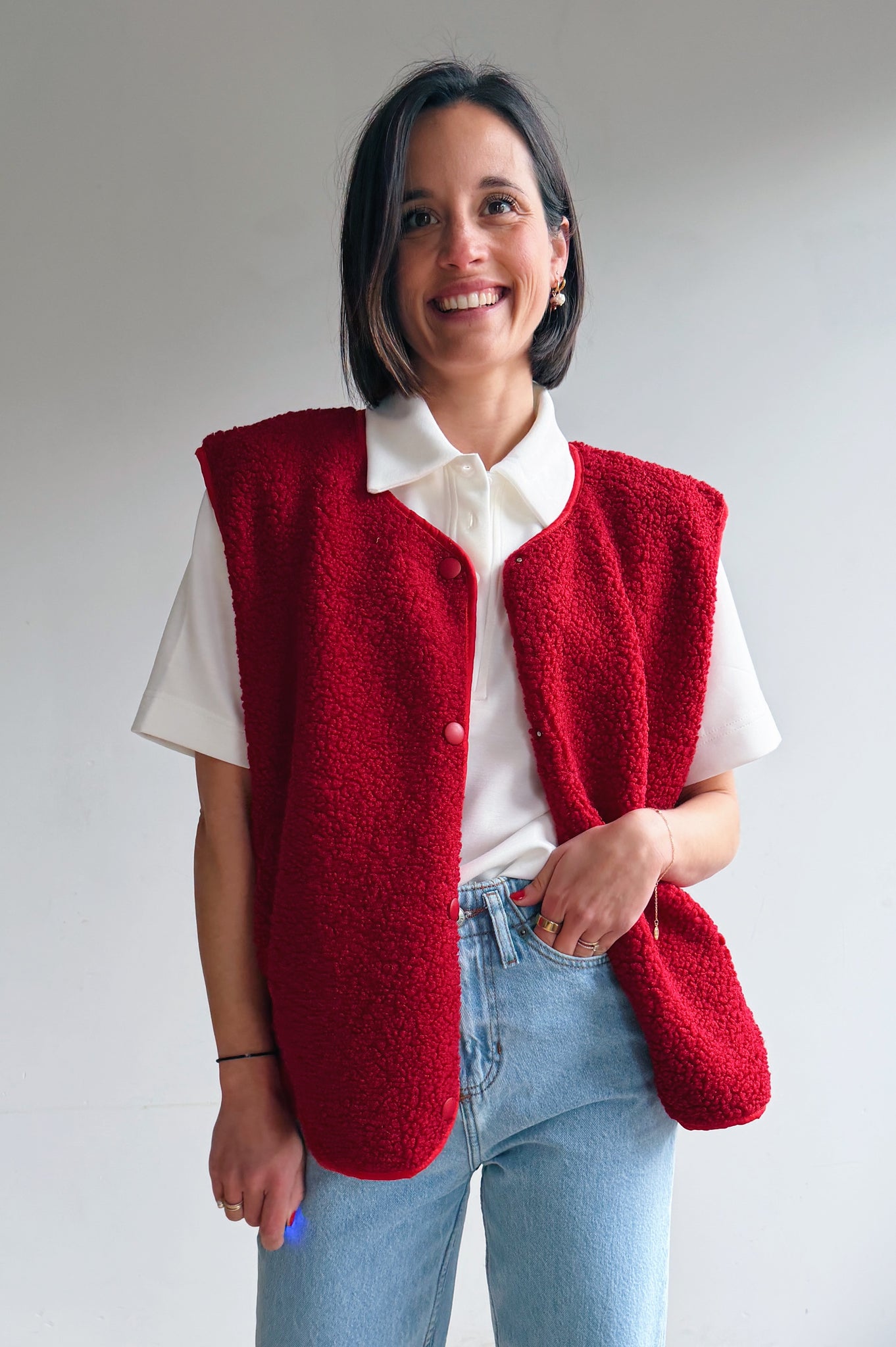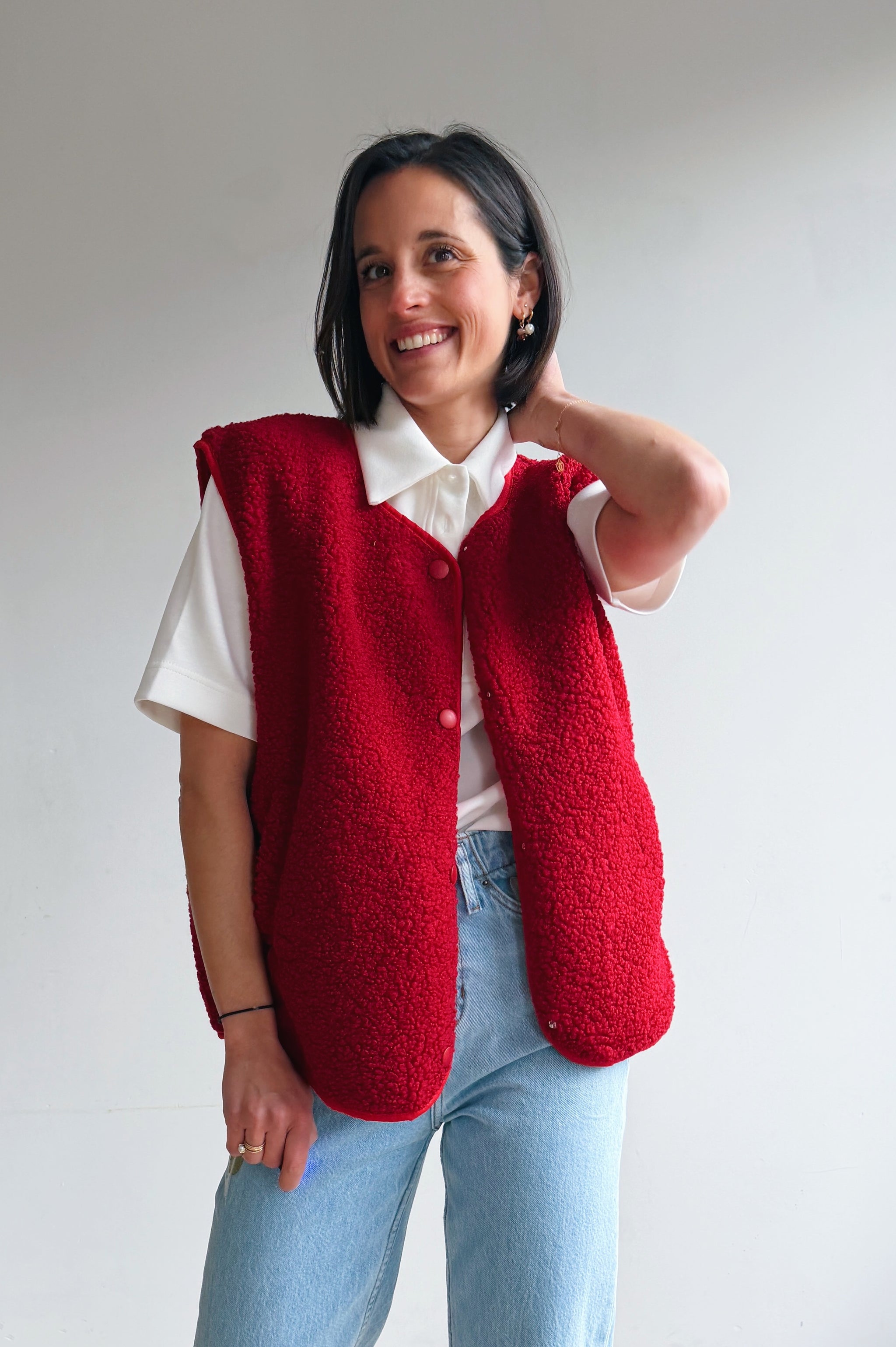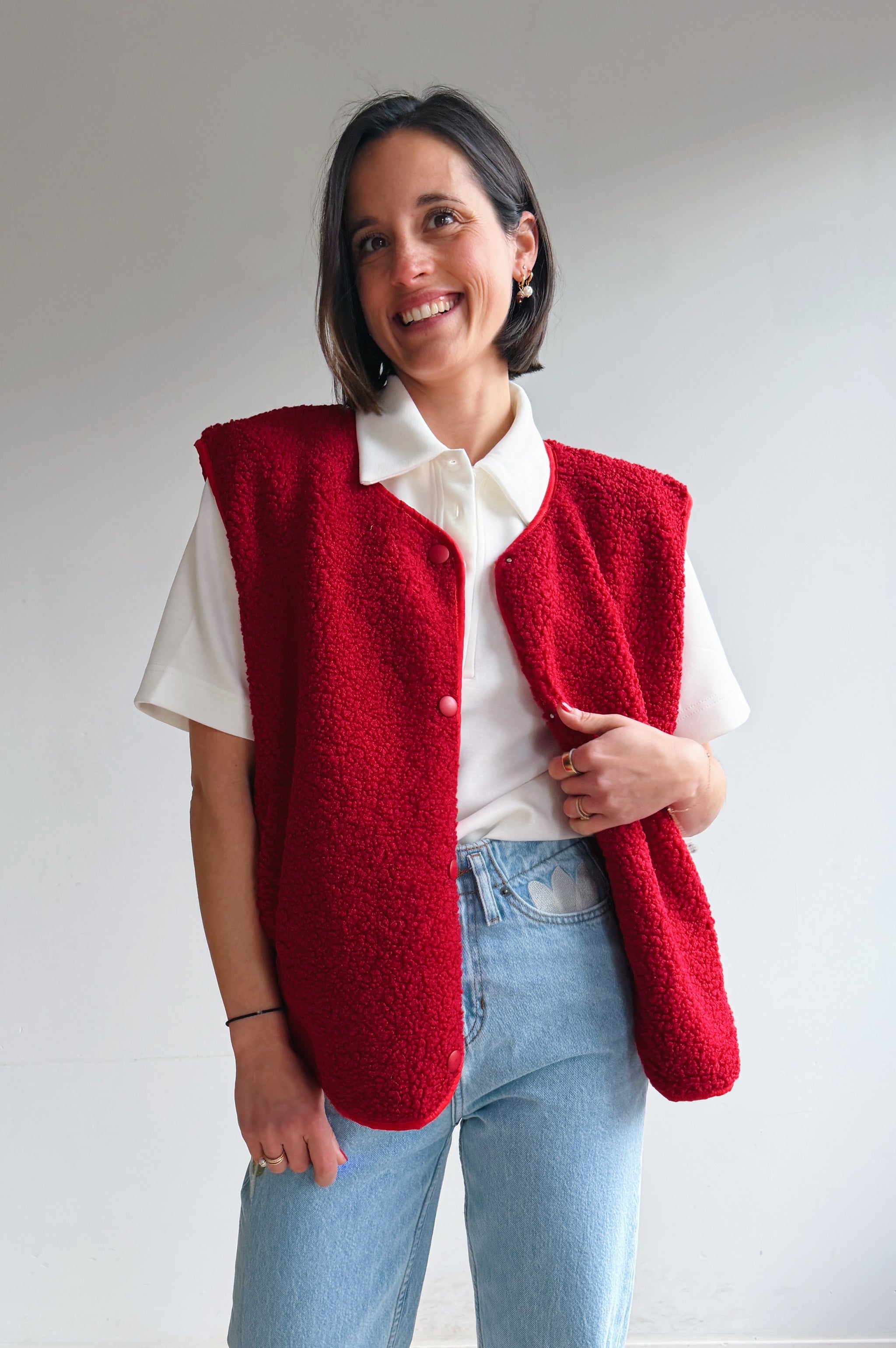 De rode kleurige teddy is een heerlijk zacht en cozy item dat meteen warmte en extra laagje toevoegt aan je outfit. De teddy stof geeft een nonchalante maar modieuze uitstraling en de rode kleur maakt hem makkelijk te combineren. Met de drukknopen kan je hem open of dicht dragen, afhankelijk van de look die je wil creëren. De rechte, iets boxy pasvorm zorgt ervoor dat hij comfortabel zit en een moderne, casual vibe heeft. Perfect om te dragen over een trui of t-shirt, en ideaal voor frisse dagen waarop je je toch stijlvol wil voelen.