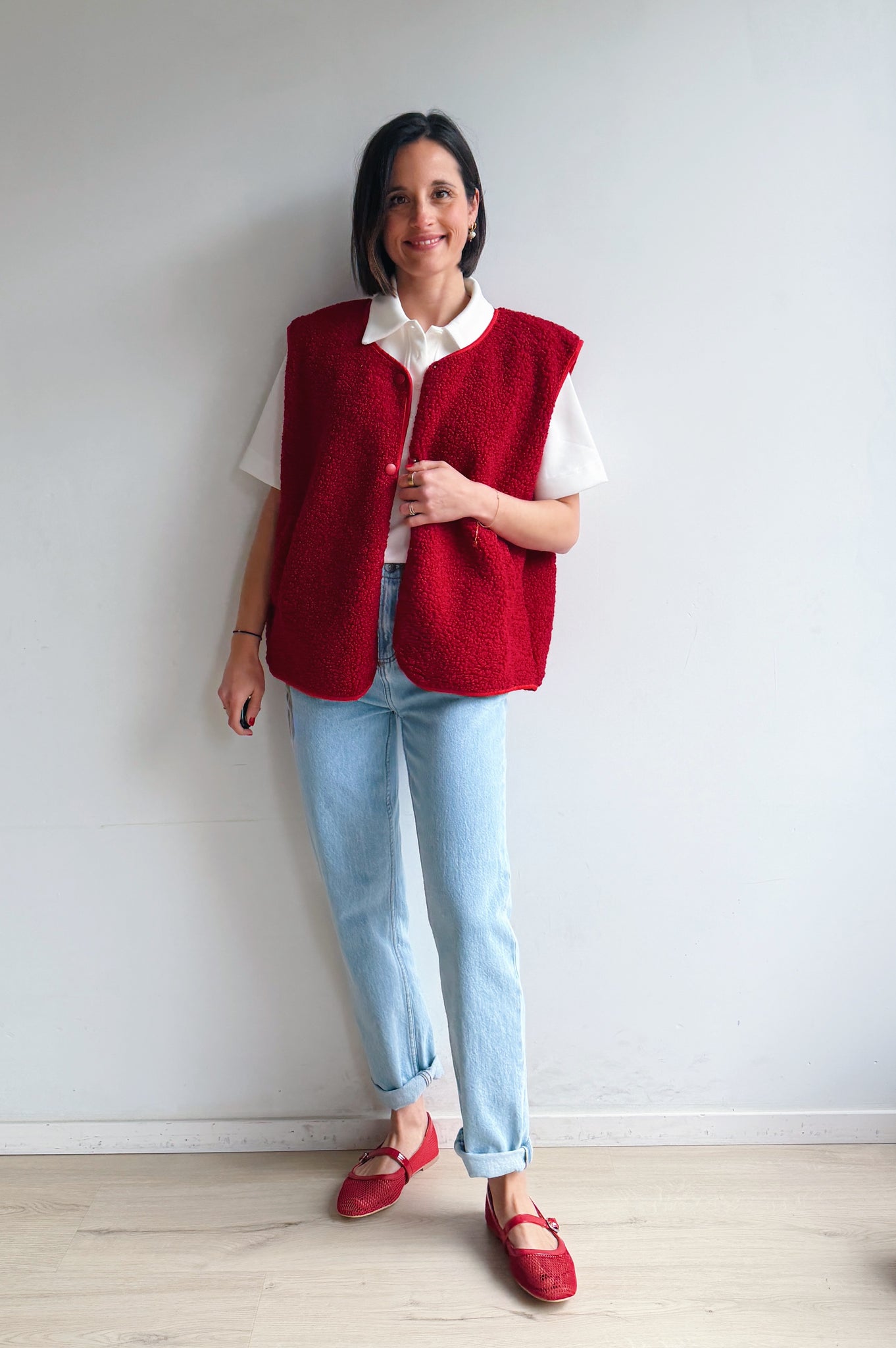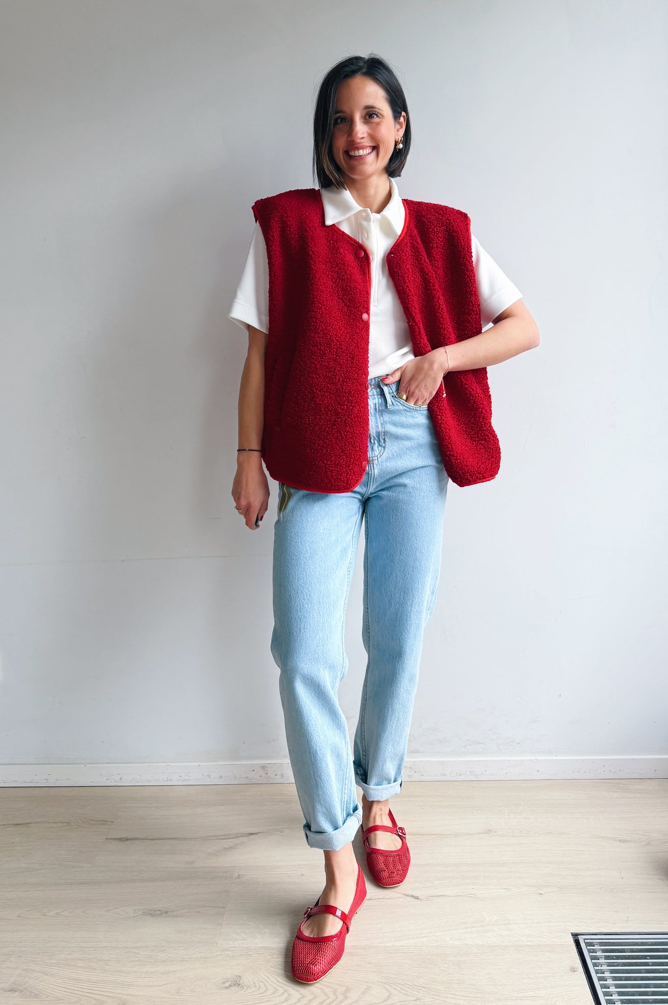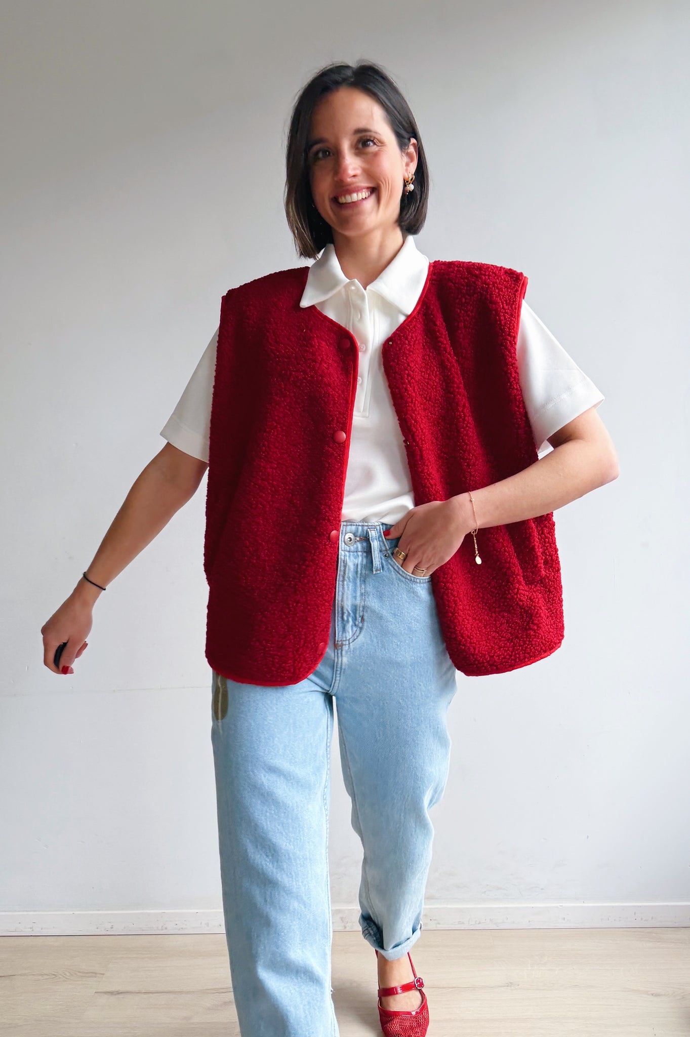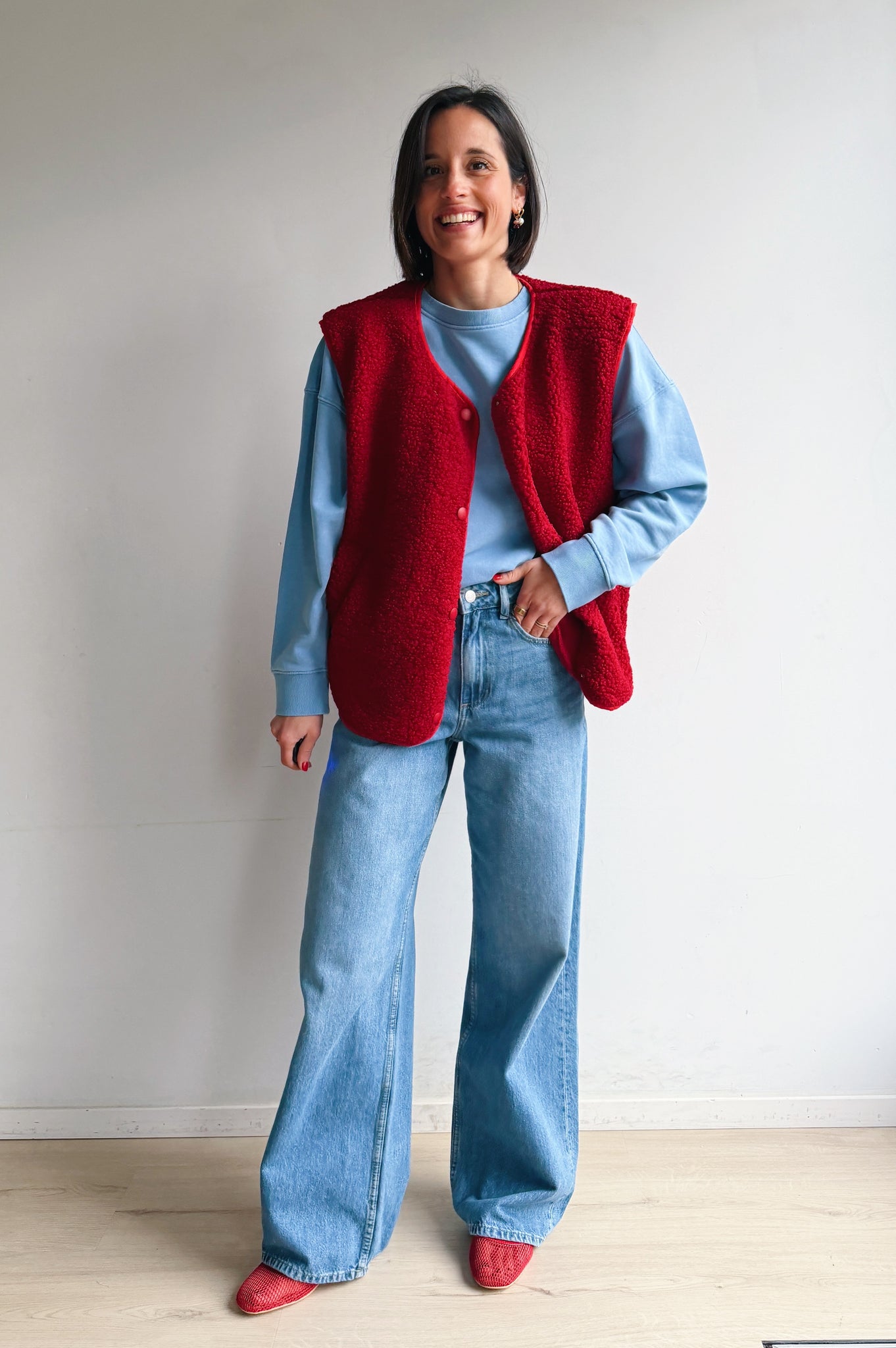 De rode kleurige teddy is een heerlijk zacht en cozy item dat meteen warmte en extra laagje toevoegt aan je outfit. De teddy stof geeft een nonchalante maar modieuze uitstraling en de rode kleur maakt hem makkelijk te combineren. Met de drukknopen kan je hem open of dicht dragen, afhankelijk van de look die je wil creëren. De rechte, iets boxy pasvorm zorgt ervoor dat hij comfortabel zit en een moderne, casual vibe heeft. Perfect om te dragen over een trui of t-shirt, en ideaal voor frisse dagen waarop je je toch stijlvol wil voelen.