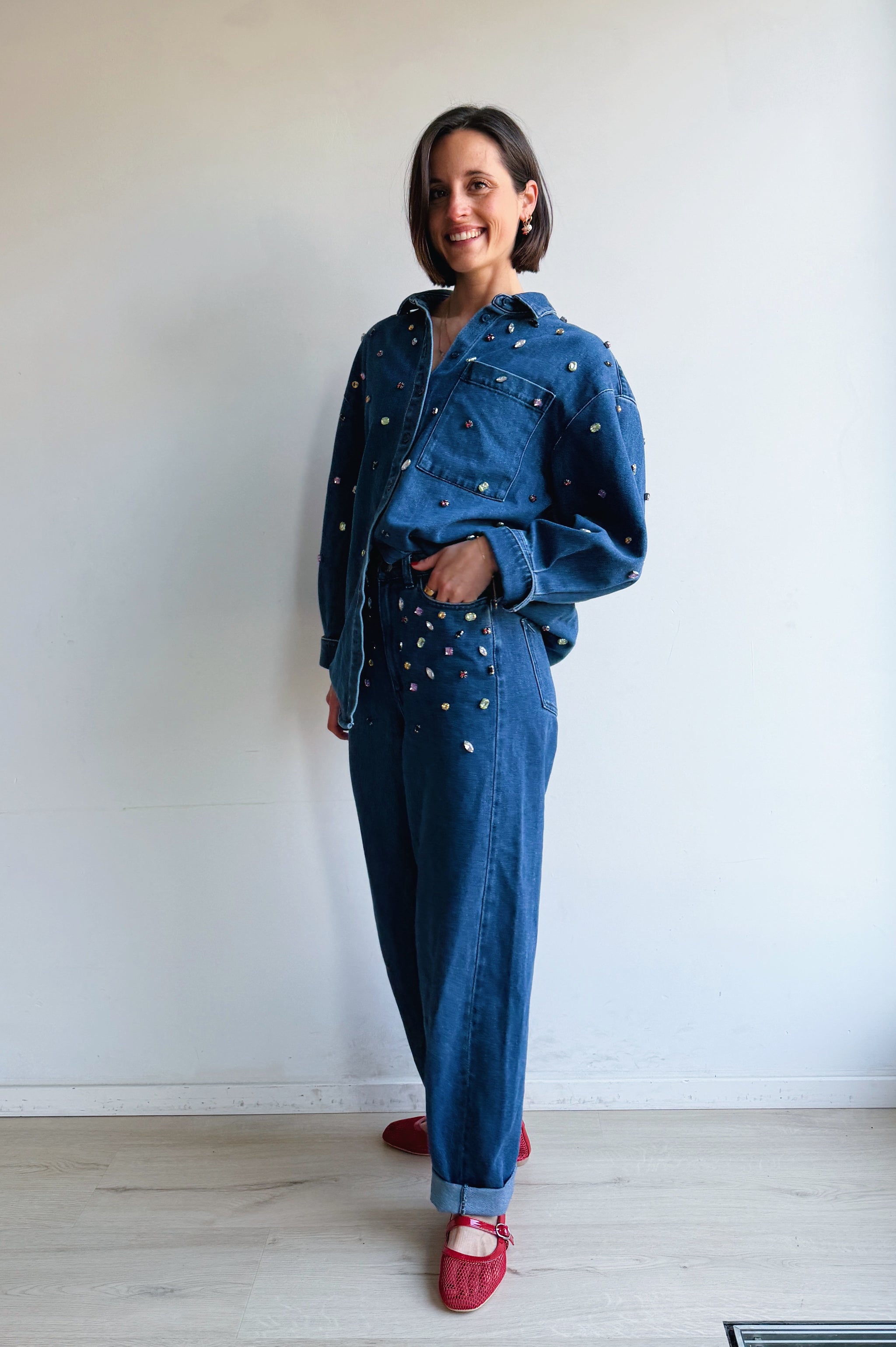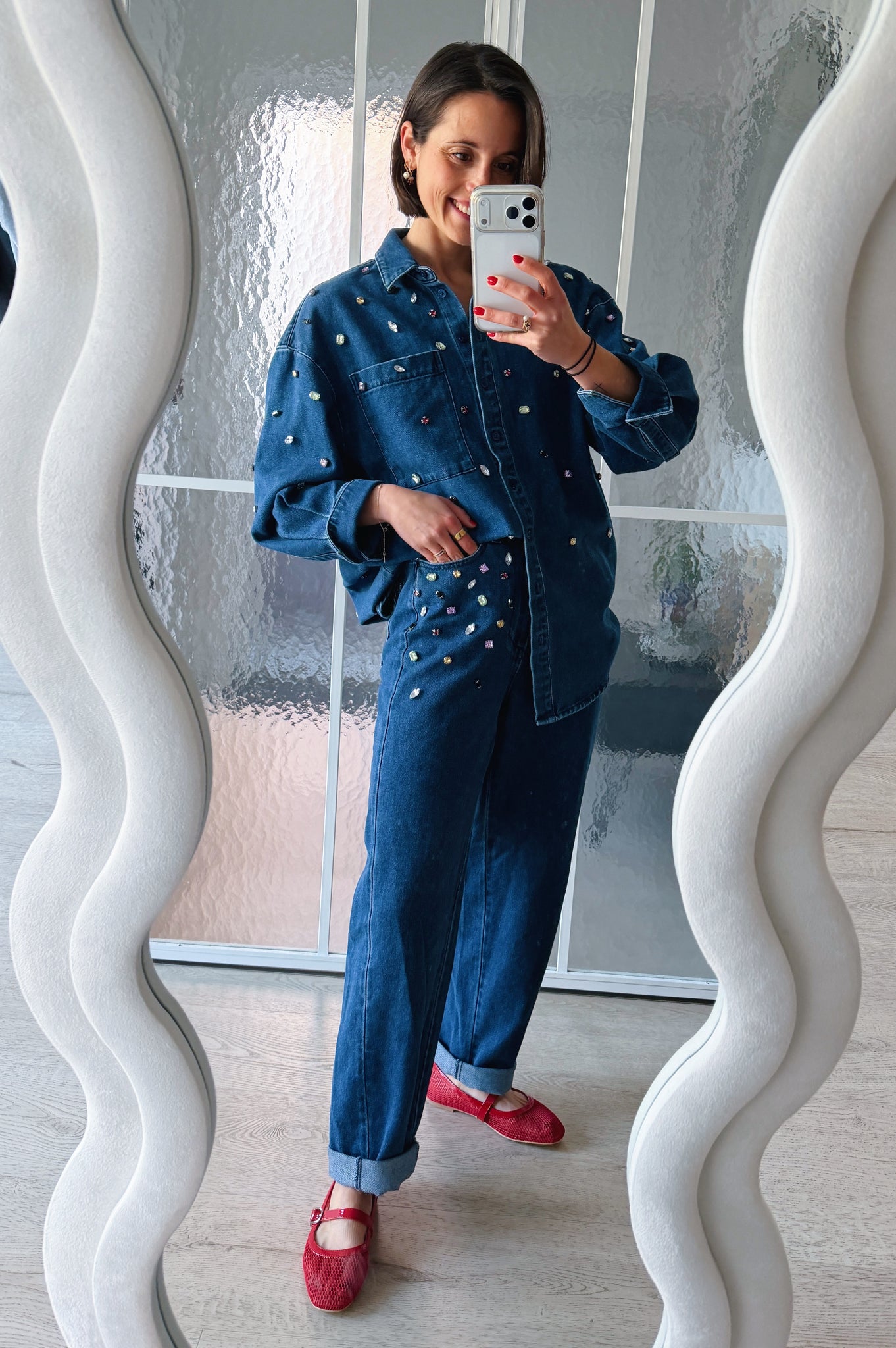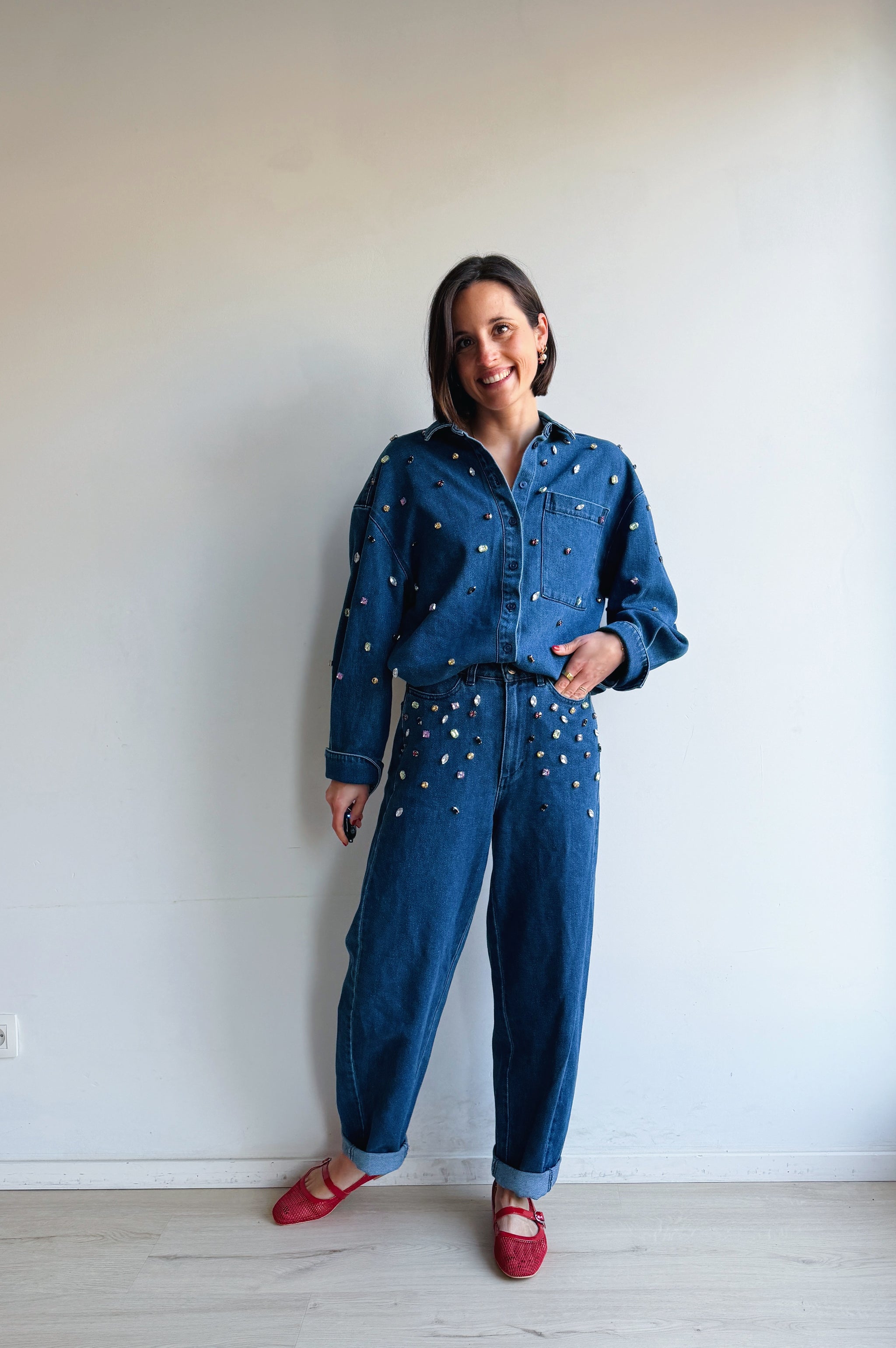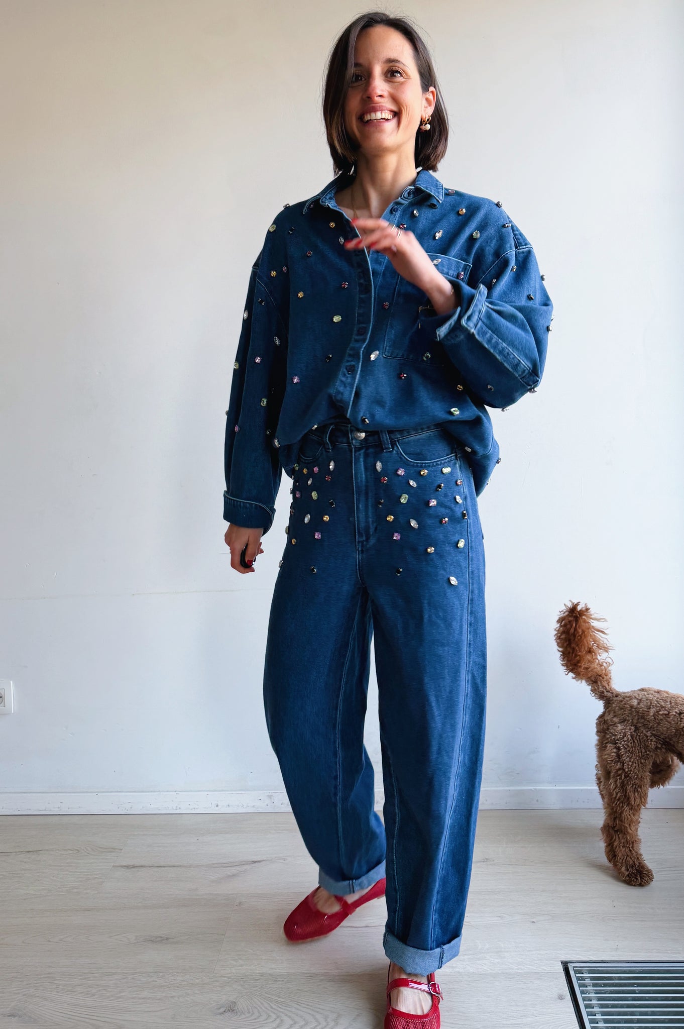 Deze prachtige barrel jeans tilt je everyday look naar een hoger niveau dankzij de subtiele, kleurrijke embellishments aan de voorkant. Combineer met een basic T-shirt voor een effortless look of draag het met de sprinkle blouse: de bijhorende embellished blouse voor een echte statement outfit.