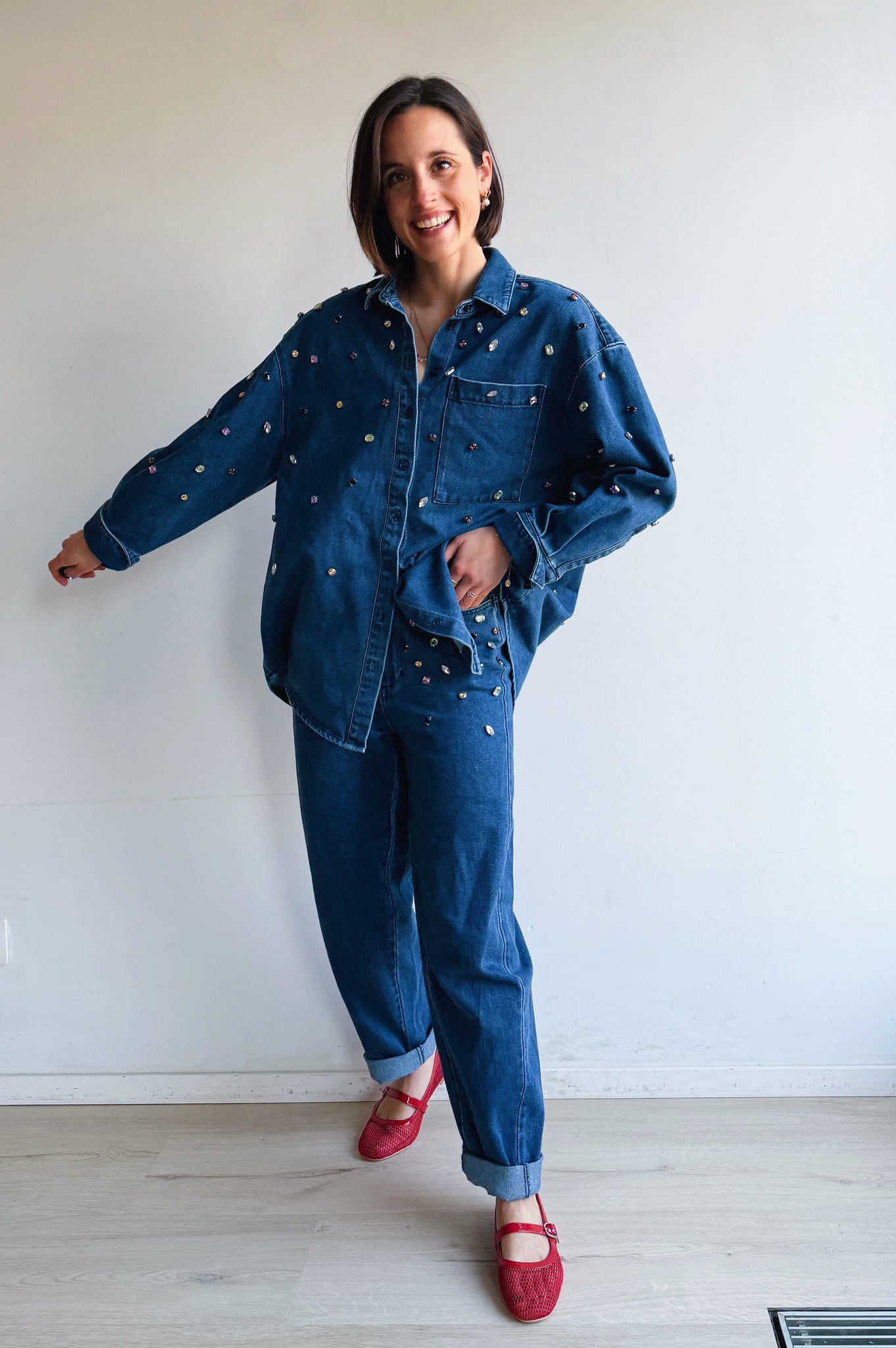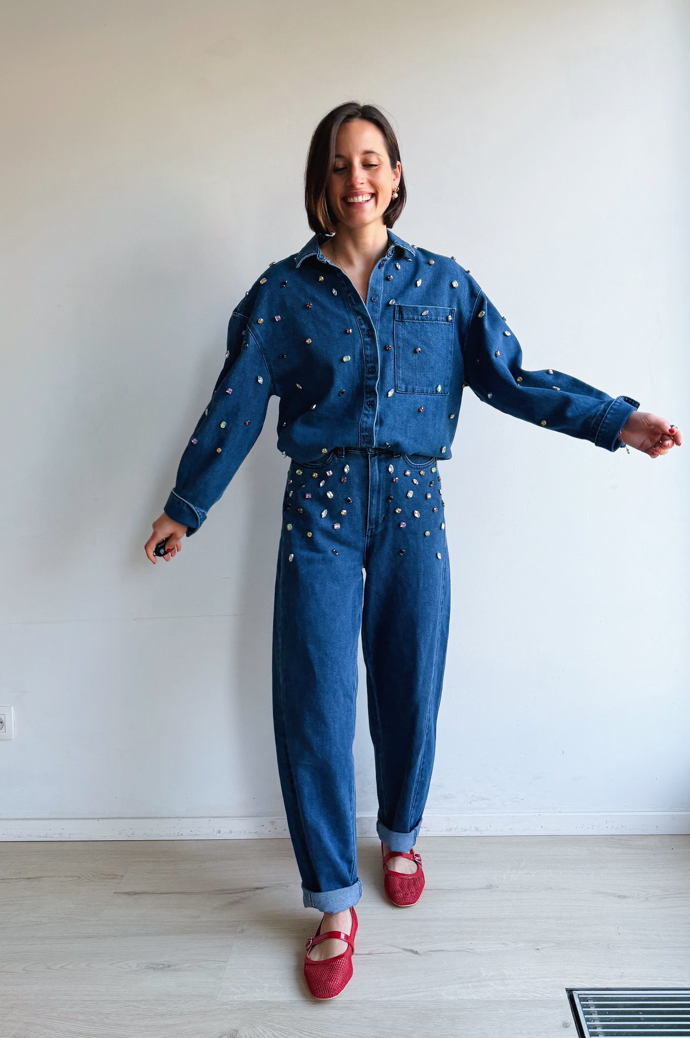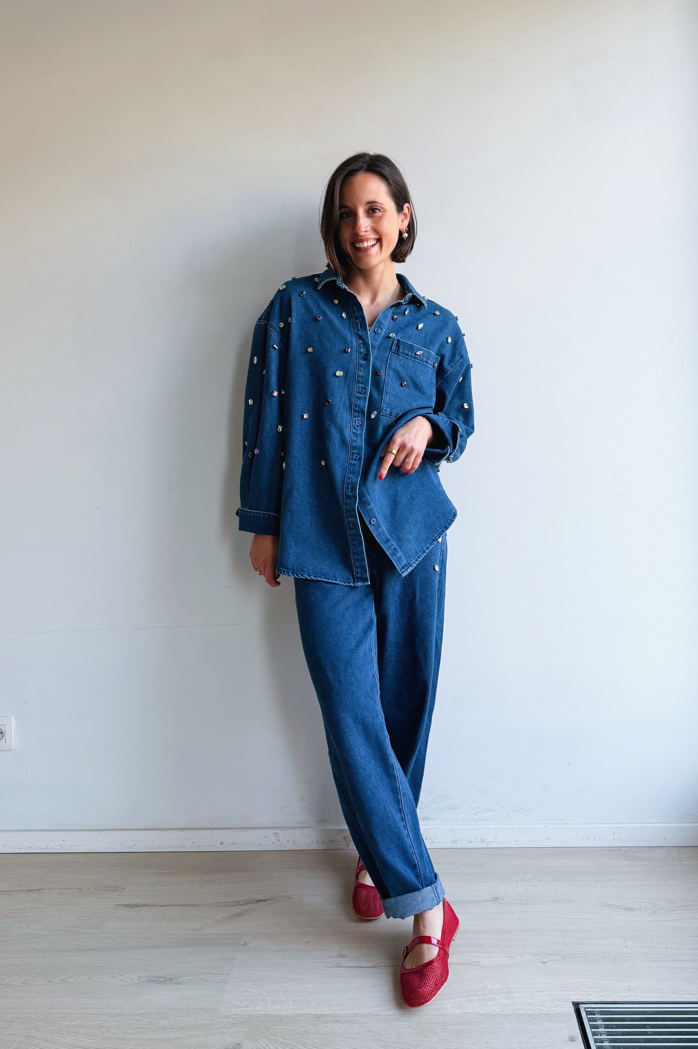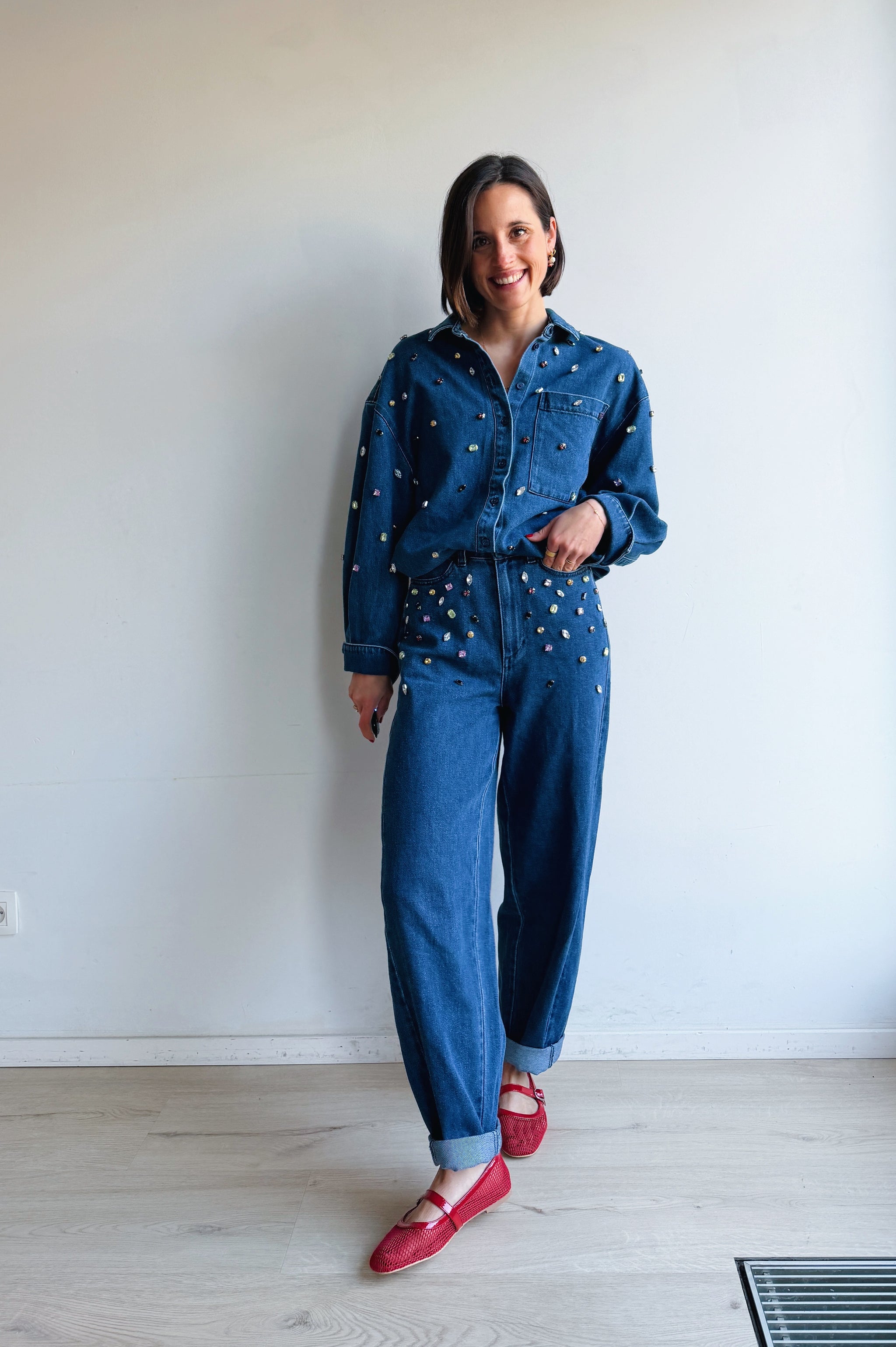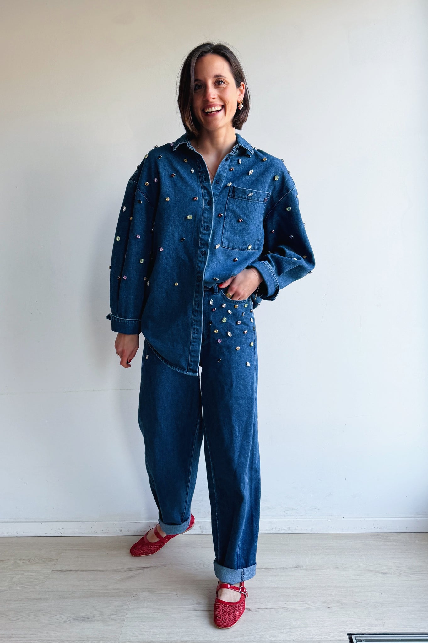 Deze prachtige barrel jeans tilt je everyday look naar een hoger niveau dankzij de subtiele, kleurrijke embellishments aan de voorkant. Combineer met een basic T-shirt voor een effortless look of draag het met de sprinkle blouse: de bijhorende embellished blouse voor een echte statement outfit.