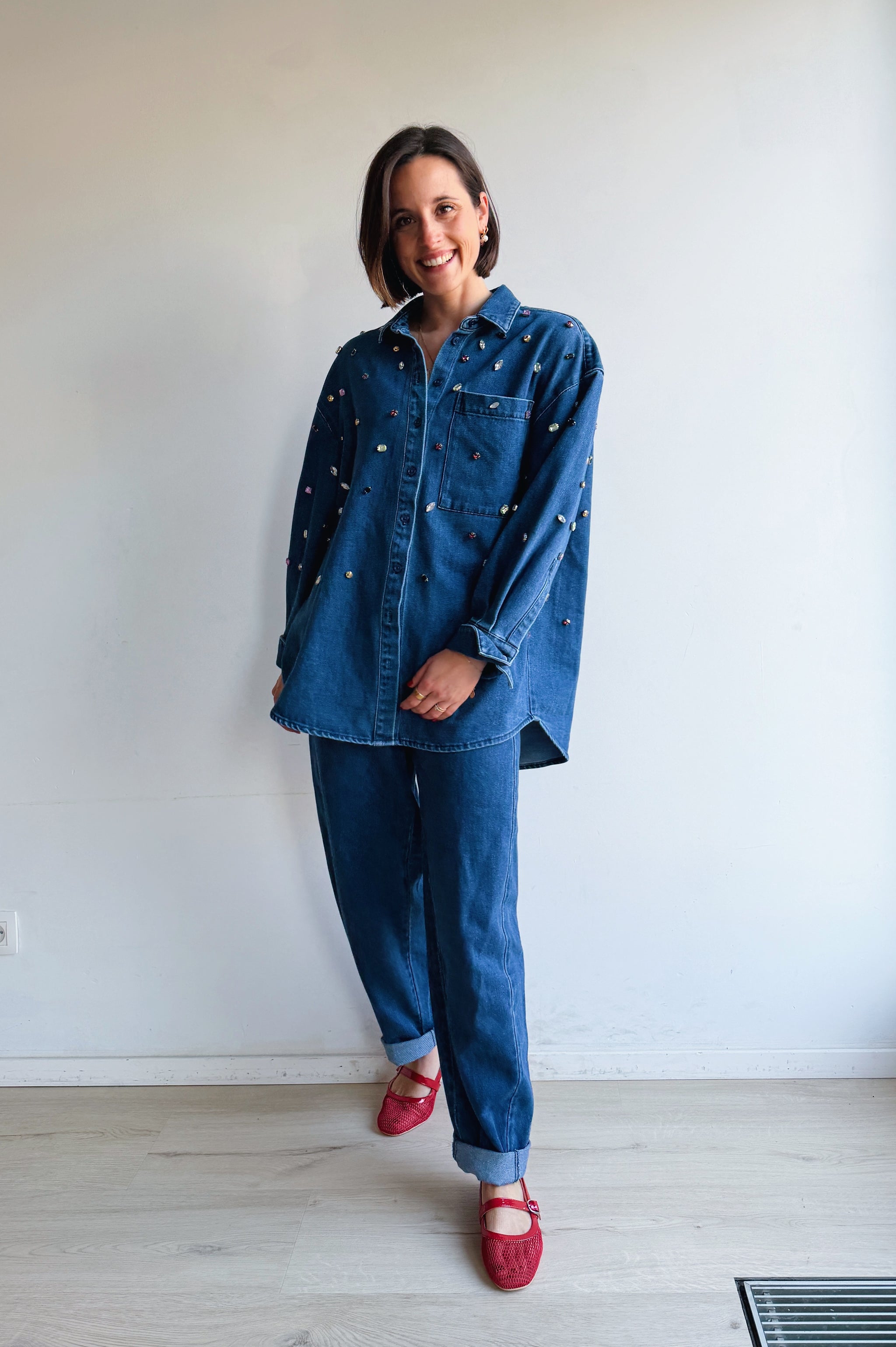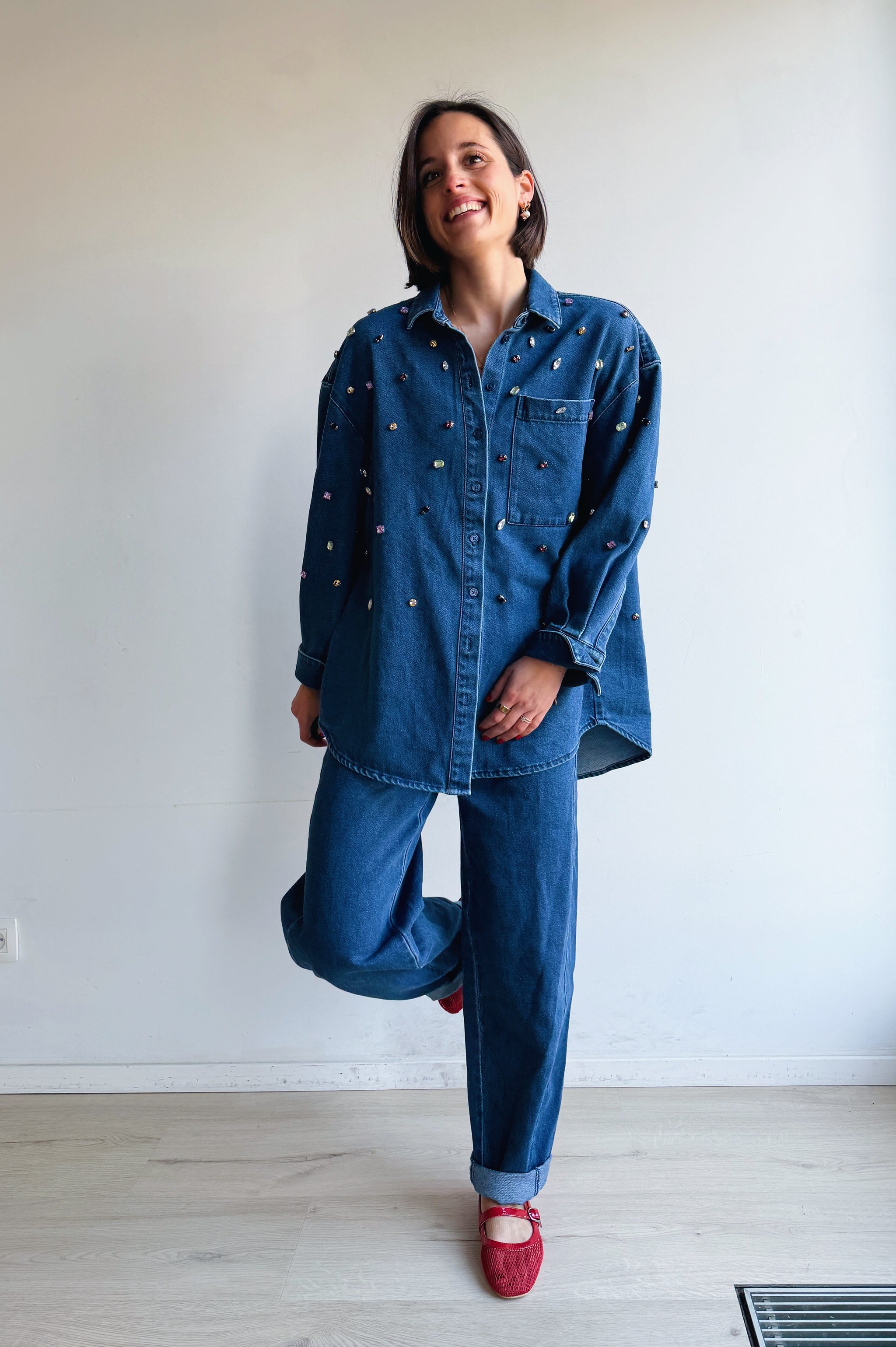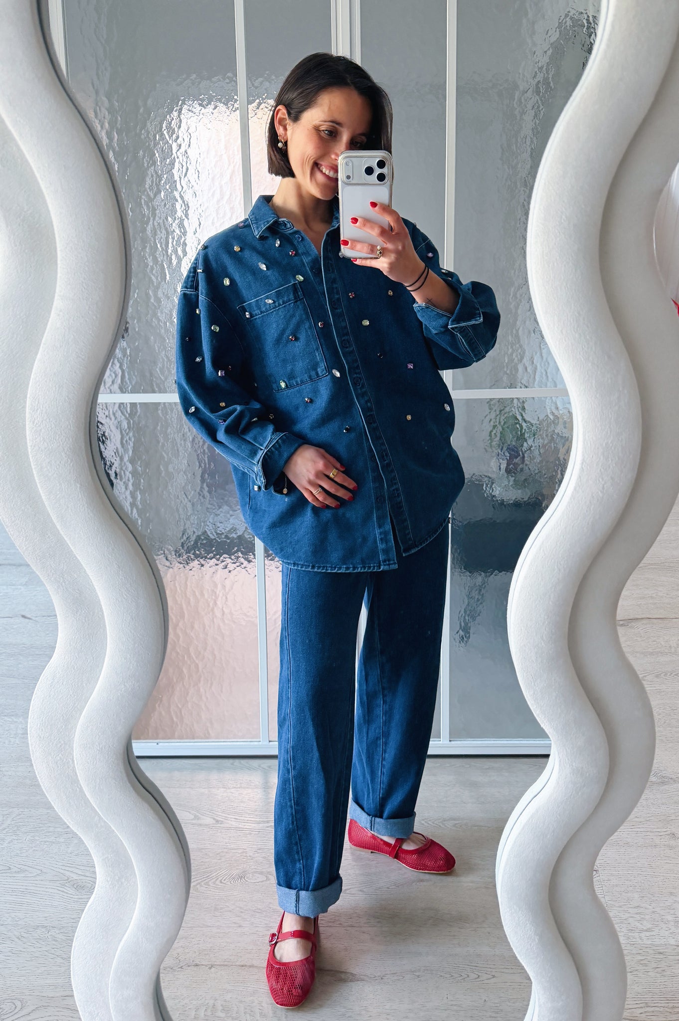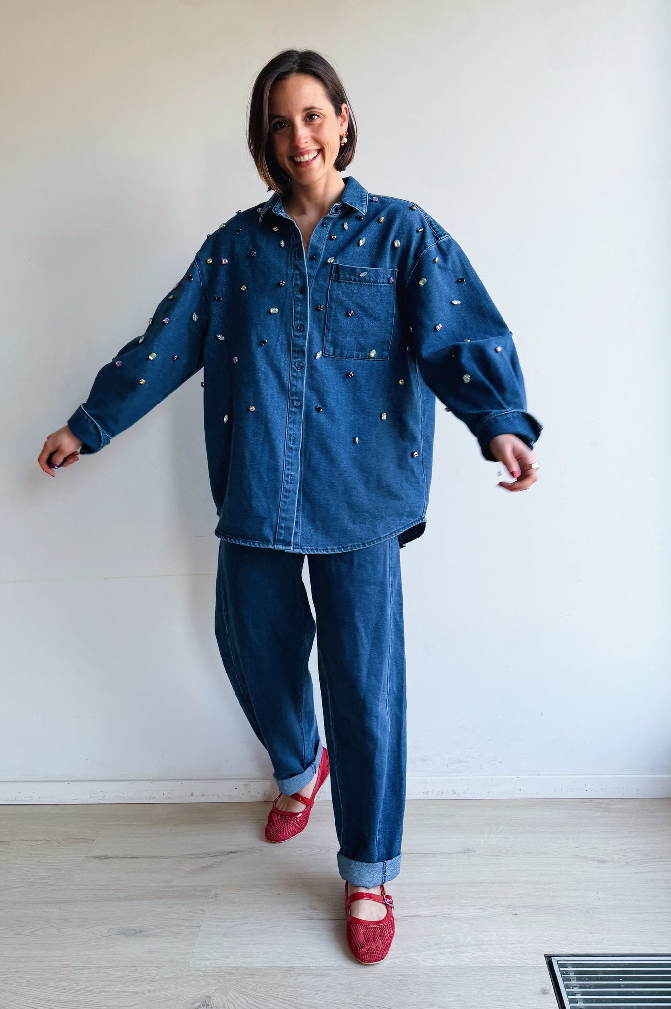 Deze prachtige barrel jeans tilt je everyday look naar een hoger niveau dankzij de subtiele, kleurrijke embellishments aan de voorkant. Combineer met een basic T-shirt voor een effortless look of draag het met de sprinkle blouse: de bijhorende embellished blouse voor een echte statement outfit.